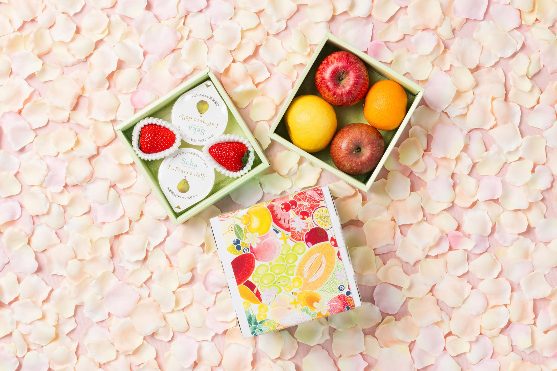 上段に新商品の「山形ラフランスゼリー」2個といちごを、下段にりんごと柑橘を詰め合わせました。