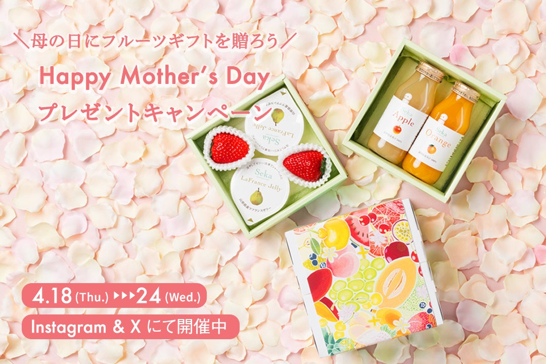 「Seika フルーツギフト店」では母の日に先がけて、4月18日(木)~24日(水)の期間中、抽選で5名様に新商品「山形ラフランスゼリーといちご&国産100%ジュースのミニお重セット」を体験いただけるプレゼントキャンペーンを開催しております。