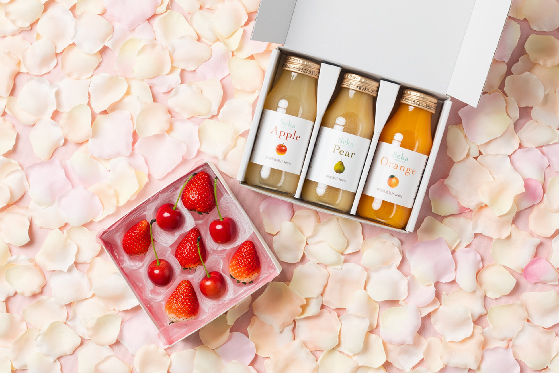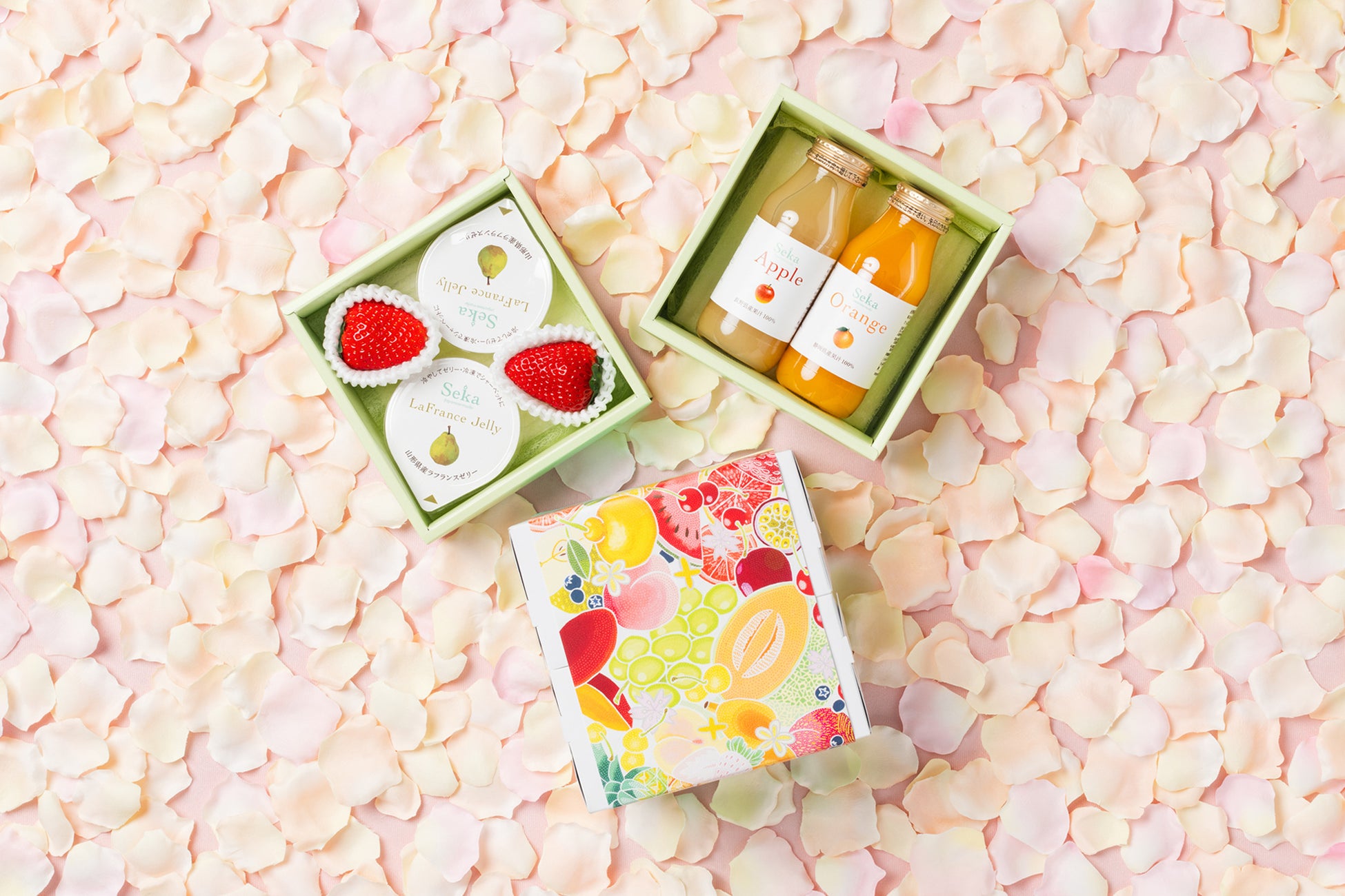 上段に「山形ラフランスゼリー」2個といちごを、下段に国産果汁100%の「りんごジュース」と「みかんジュース」を詰め合わせました。