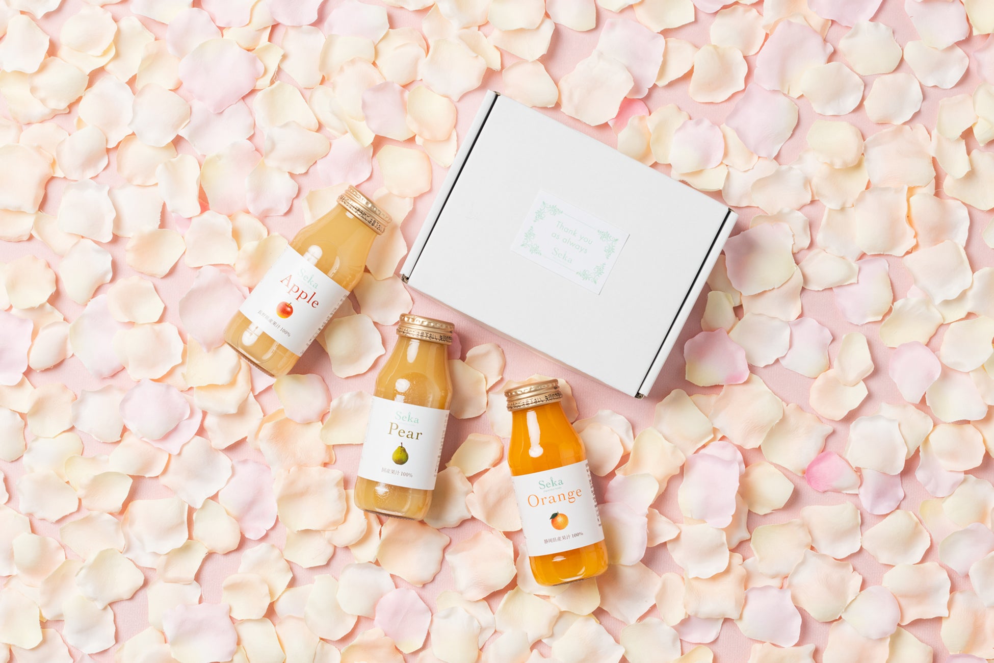 「THANK YOU」とデザインされたボックスに国産果汁100%の「りんごジュース」「ラフランスジュース」「みかんジュース」を詰め合わせました。