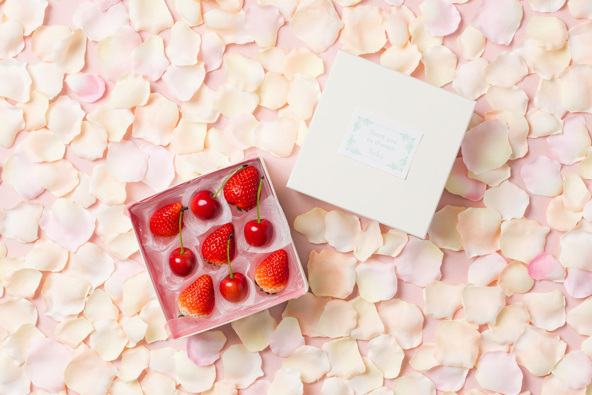 「THANK YOU」とデザインされたギフトボックスをあけると、可愛らしいさくらんぼといちごが目に飛び込んでくる、母の日にぴったりなギフトセットです。