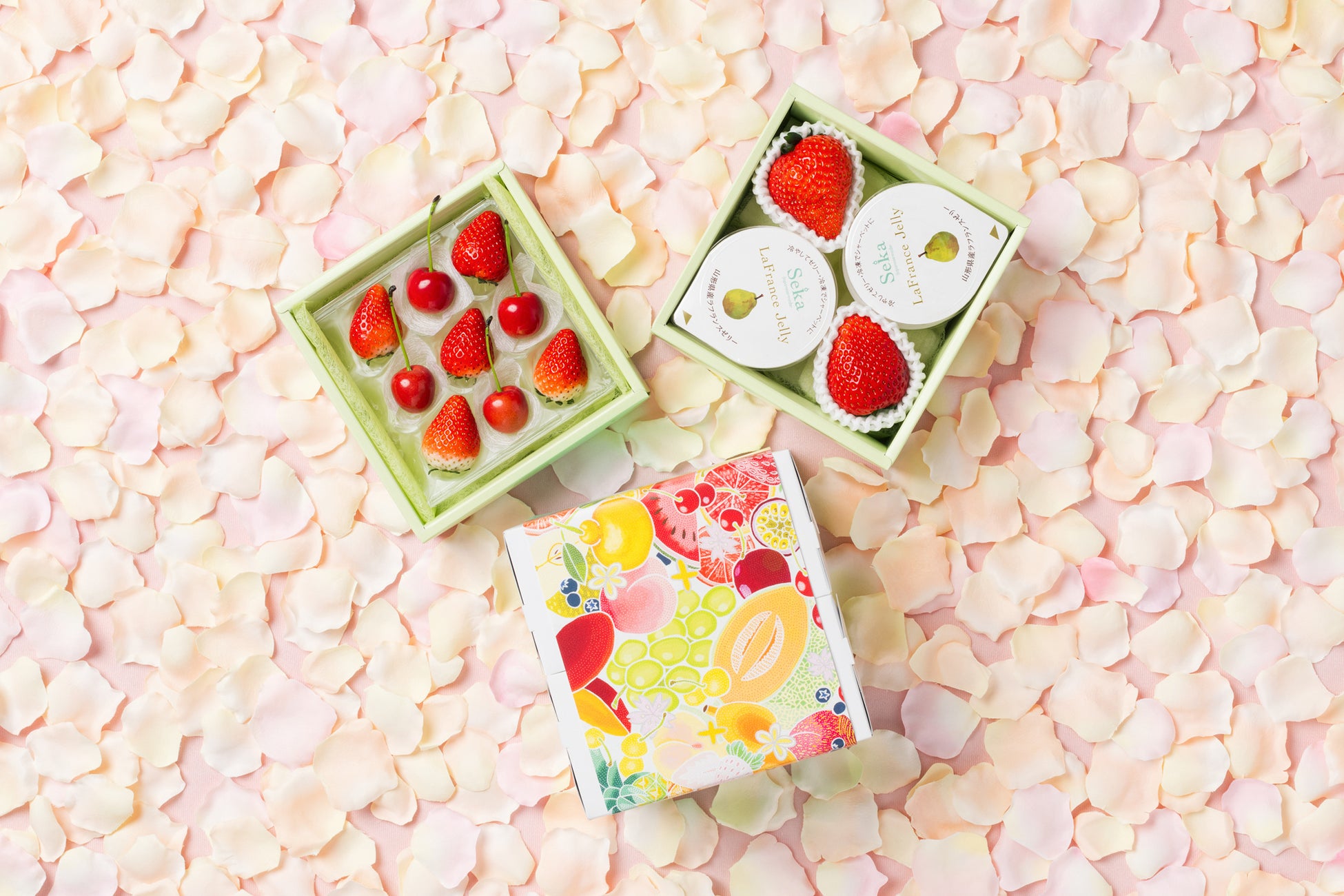 上段に山形県産さくらんぼといちごを、下段に新商品の「山形ラフランスゼリー」4個といちごを詰め合わせました。