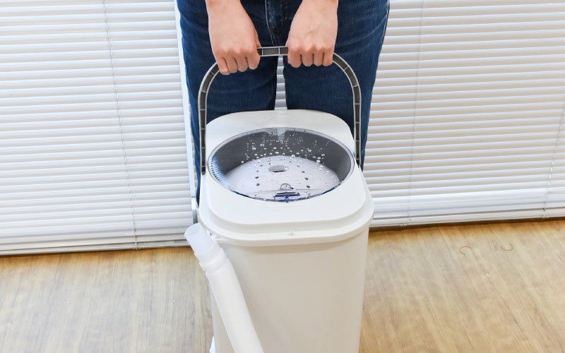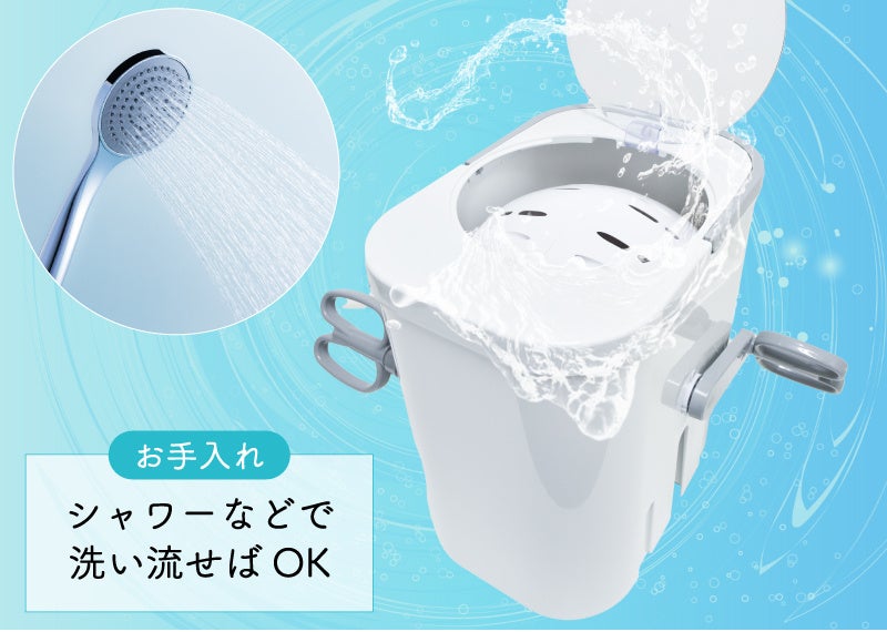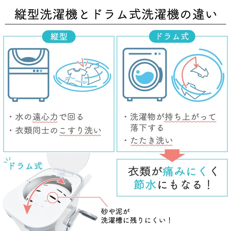 洗濯槽に水と洗濯物、洗剤を入れて準備完了。本体のハンドルを回すと洗濯槽が回転。ドラム式で洗濯槽の上部から下に衣類をたたきつけることで汚れを落とすたたき洗いで衣類を痛めにくく優しく洗うことができます。衣類についた砂やドロも下に落とすことでしっかりと洗うことが可能。排水ホースを下げて排水し、水を追加で入れすすぎを行います。洗濯槽部分にシャワーを直接かけて丸ごと洗うことが可能。お手入れも簡単に行えます。