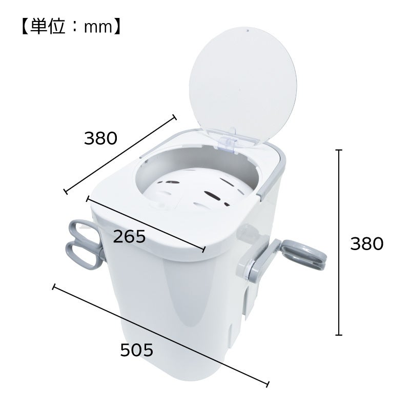 高さ380×幅265×奥行380mm。約3kgと軽量コンパクト。最大容量9L(Tシャツ4~5枚)まで対応。