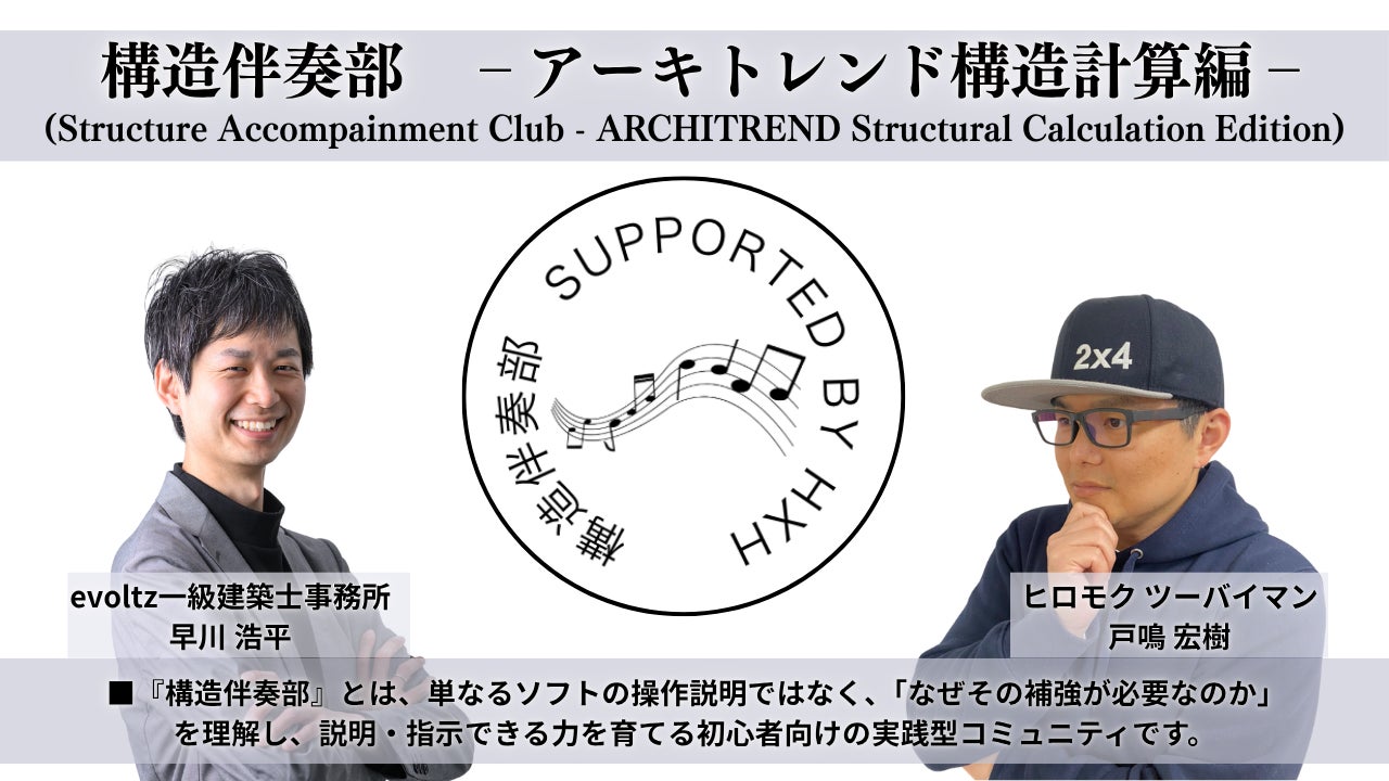 evoltz一級建築士事務所(管理建築士:早川浩平)と構造設計事務所のヒロモク(代表:戸鳴宏樹)は、木造住宅の構造計算に携わる設計者を対象とした、日本初のオンライン実践型コミュニティ**『構造伴奏部 ーアーキトレンド構造計算編ー』**を2026年4月より開始いたします。