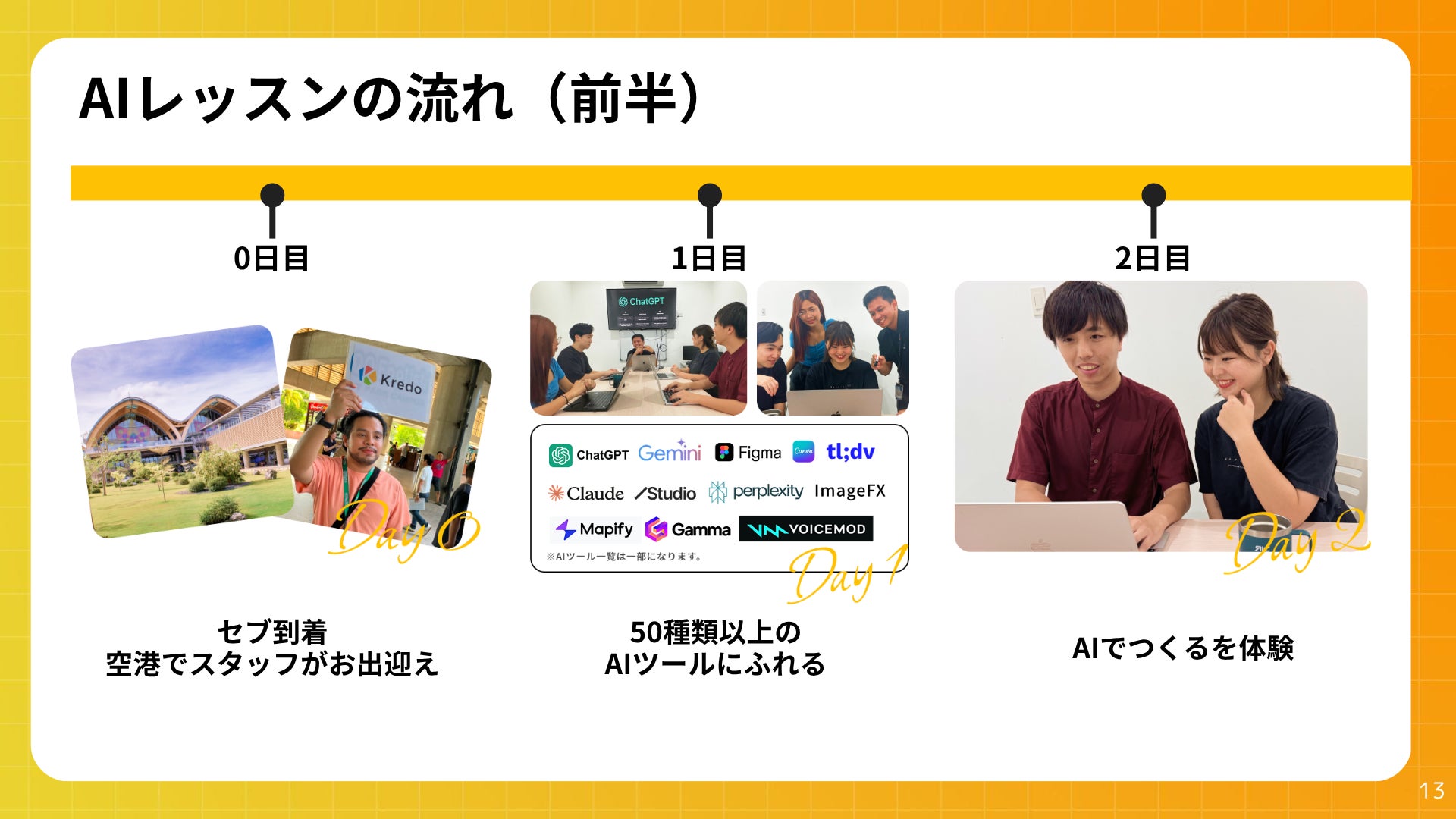 Kredo AI留学では、こうした課題の中で、まずは生成AIの活用方法や効果を知ってもらうことを目的に、「様々な生成AIツールに実践的に触れてアウトプットを出す」という点に焦点をおいています。
