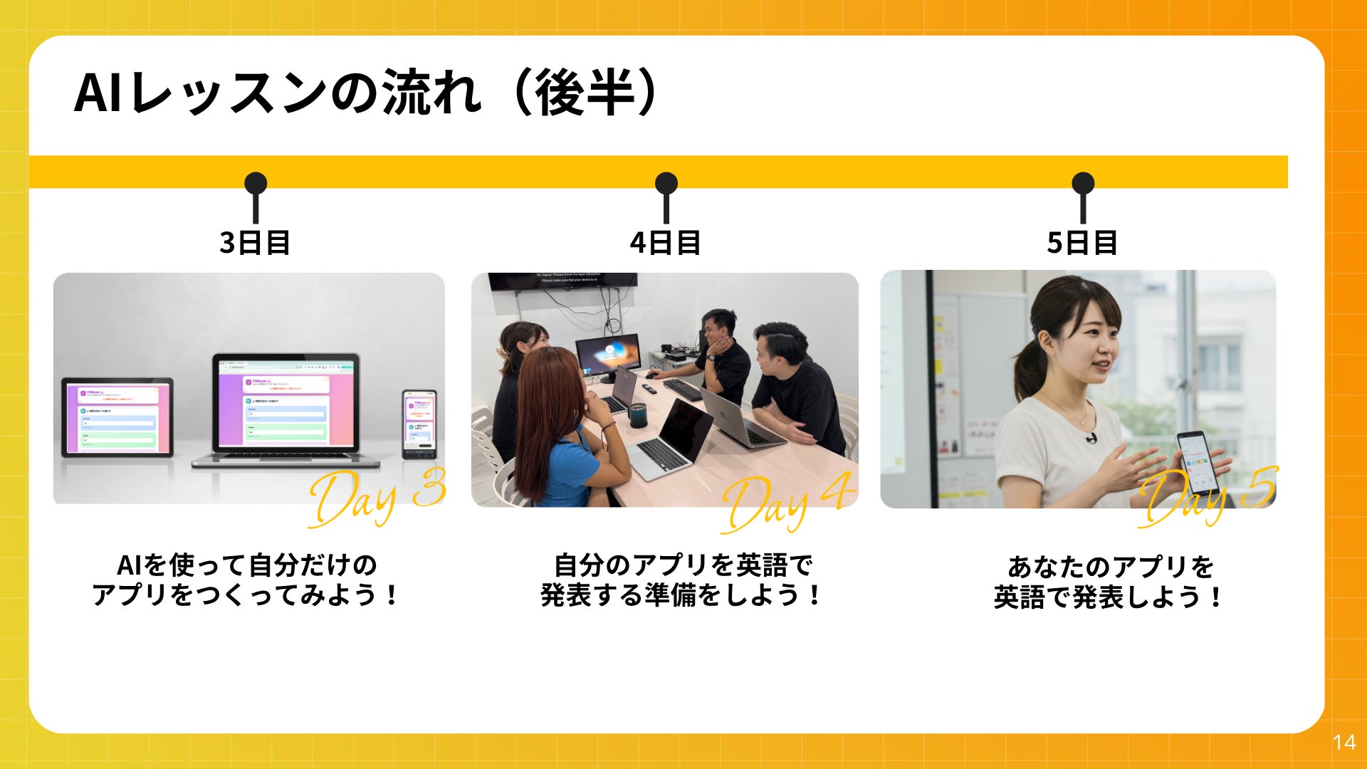 英語×AIの事前知識がない状態からでも、 講師陣が徹底的にサポートし、ノーコードツールと生成AIツールを活用しながら、最終日には“自分のアプリを英語で発表”するところまで行います。