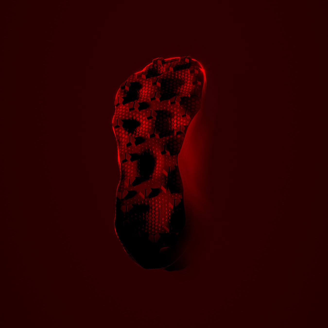 着足時の足裏への突き上げによる圧力は疎らとなっており、これによって足の疲労や痛みにつながりやすくなります。そこでサロモンでは科学的研究結果に基づいて圧力がより強くかかる箇所をくりぬいた部分半球形状のアウトソールを開発。足裏への圧力を拡散し、均等化されることで足への疲 労感や不快感を軽減します。