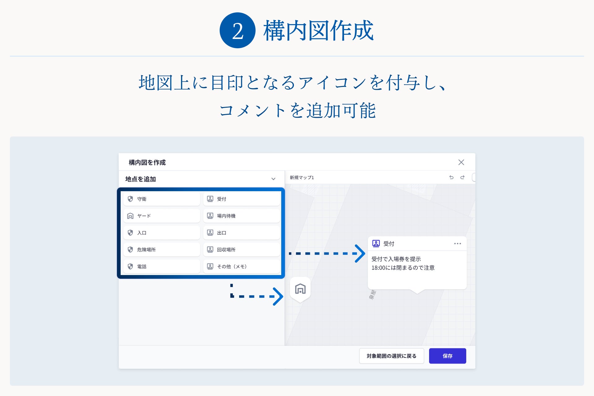「カルテ」のマップ上の任意地点に対し、自由に文字入力と図形描画ができる機能です。従来の「カルテ」でも納入手順を明記したり、選択した構内図に対してアイコンとコメントを付与することは可能でしたが、マップにそもそも表示されていない建物内部の情報(=場内図)を詳細に記入し共有することは難しく、企業様によっては「カルテ」とスライド資料の併用を強いてしまうケースもございました。