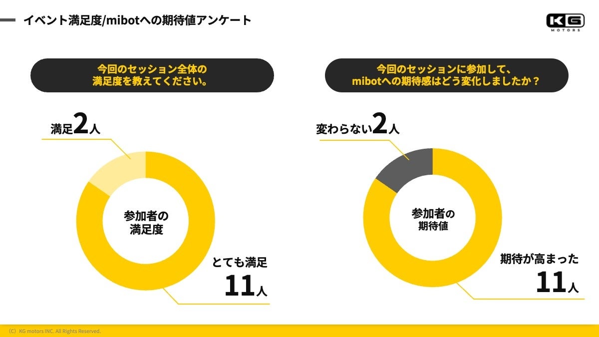 セッション後のアンケートでは、84.6%が「とても満足」、15.4%が「満足」と回答し、参加者全員が肯定的な評価を示しました。また、84.6%が「mibotへの期待が高まった」と回答しており、体験を通じて製品への関与と信頼感が一層強まった結果となりました。