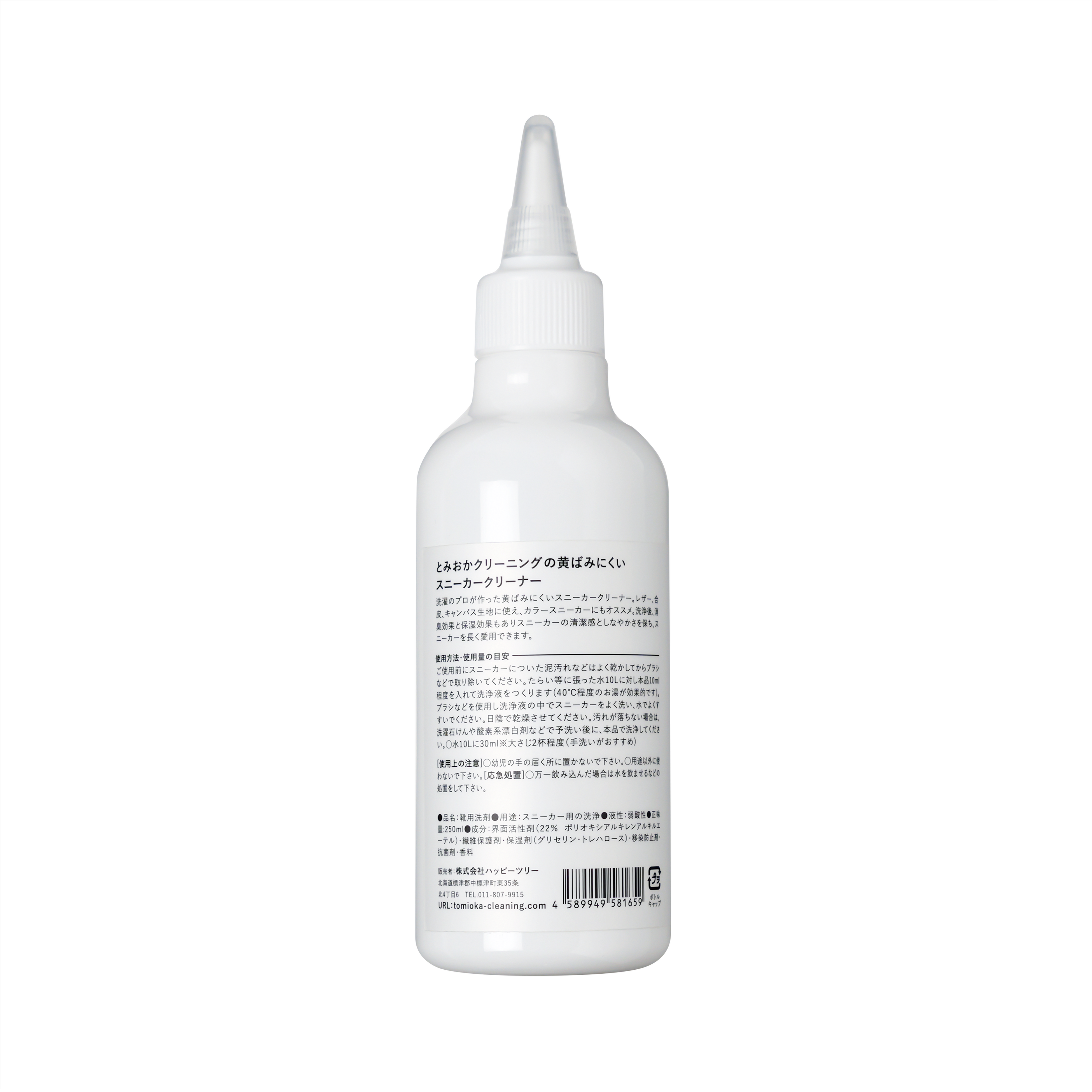 せっかくきれいに洗ったスニーカー。乾燥後「黄ばんだ」経験はありませんか?こんなお悩みを解消すべく黄ばみにくいスニーカークリーナーを商品化しました。一般的に、アルカリ性の液剤が生地に残り、日光に当てた場合化学反応を起こして黄ばむと言われています。黄ばみにくいスニーカーは弱酸性の液性のため黄ばみを軽減。※洗浄後はしっかりすすぎ、陰干ししてください。