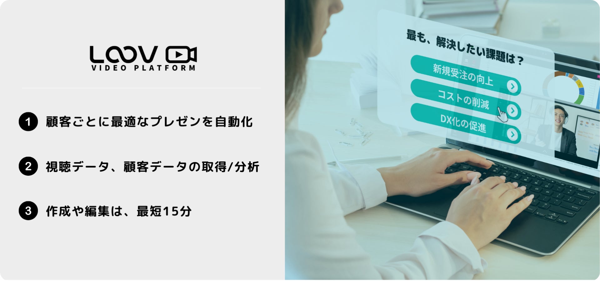 LOOV(ルーブ)はこれまで、Sales(営業)領域において、各顧客の属性に応じてプレゼン内容が自動的に変化する “対話型パーソナライズ動画” を、簡単に作成/活用することができるソリューションを提供してきました。LOOVを使えば、工数を掛けずに顧客ごとに適切な情報を提供する事が可能になることに加え、視聴データや顧客データを取得し営業活動に活かすことで、企業の営業DXの促進を図れるため、サービス開始から2年で導入企業は既に150社を突破しています。