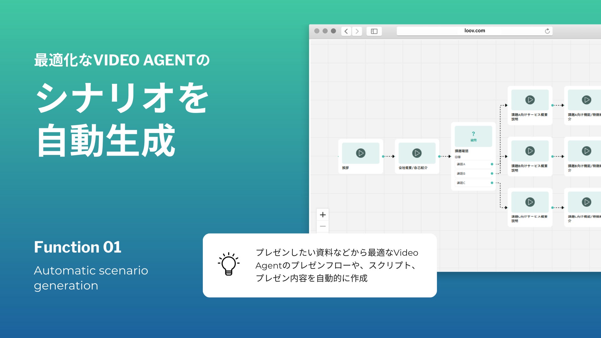 「最適な解説/説明 体験の自動化」は、労働人口の減少やハイパフォーマーの採用難易度上昇などの背景から、営業領域以外においても非常にニーズが高まっており、この度の資金調達を皮切りに、企業のあらゆるシーンにおいても「最適な解説/説明 体験の自動化」を図れるソリューションの展開を開始します。(https://loov-video.com/LP/video-agent/)