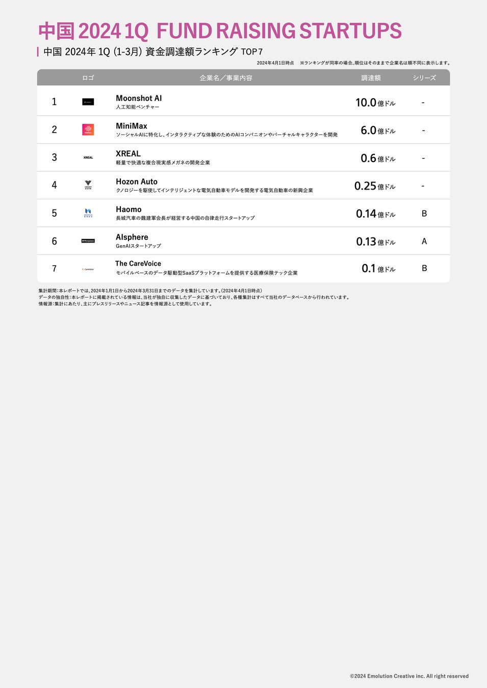 2024年 1Q 中国 スタートアップ資金調達額ランキングTOP7