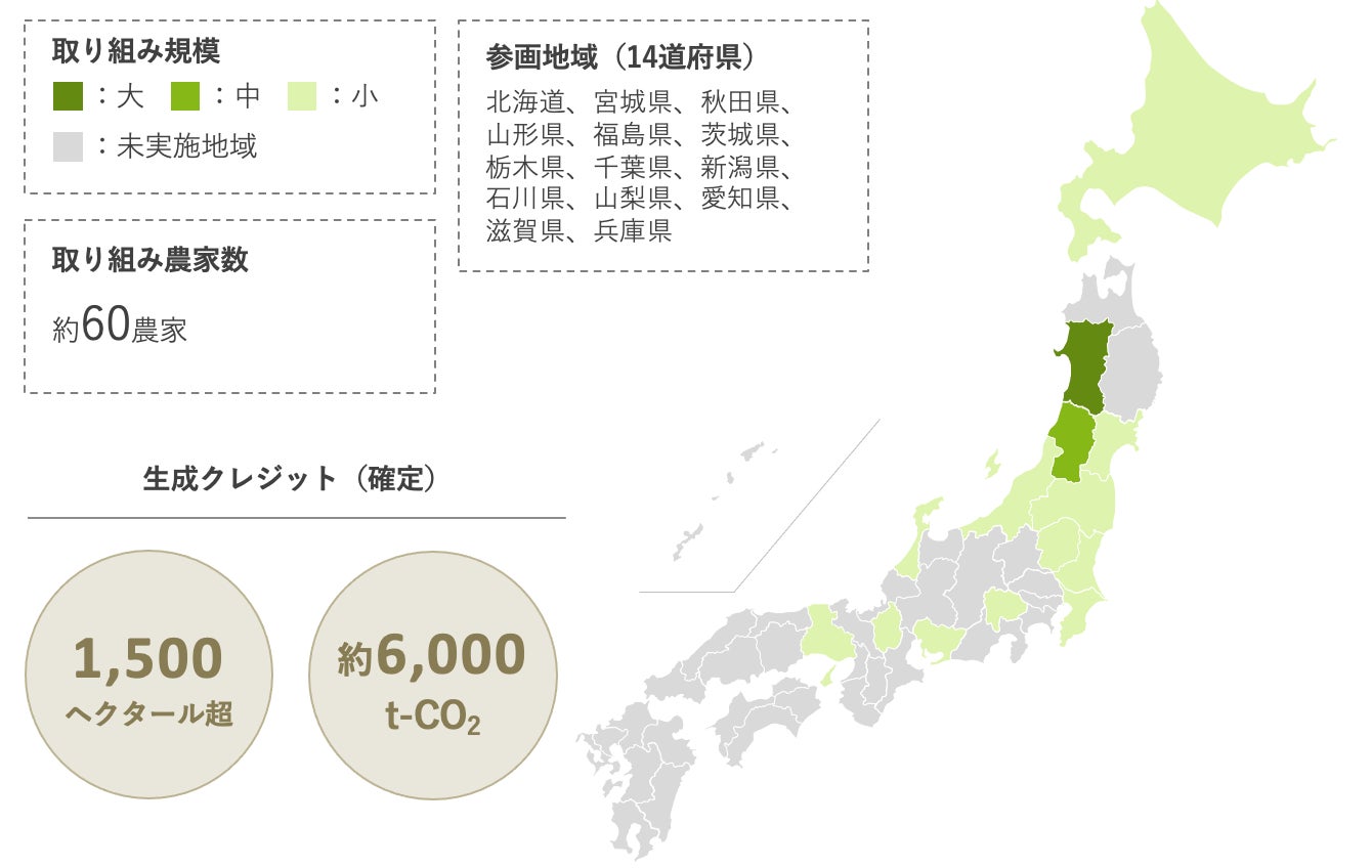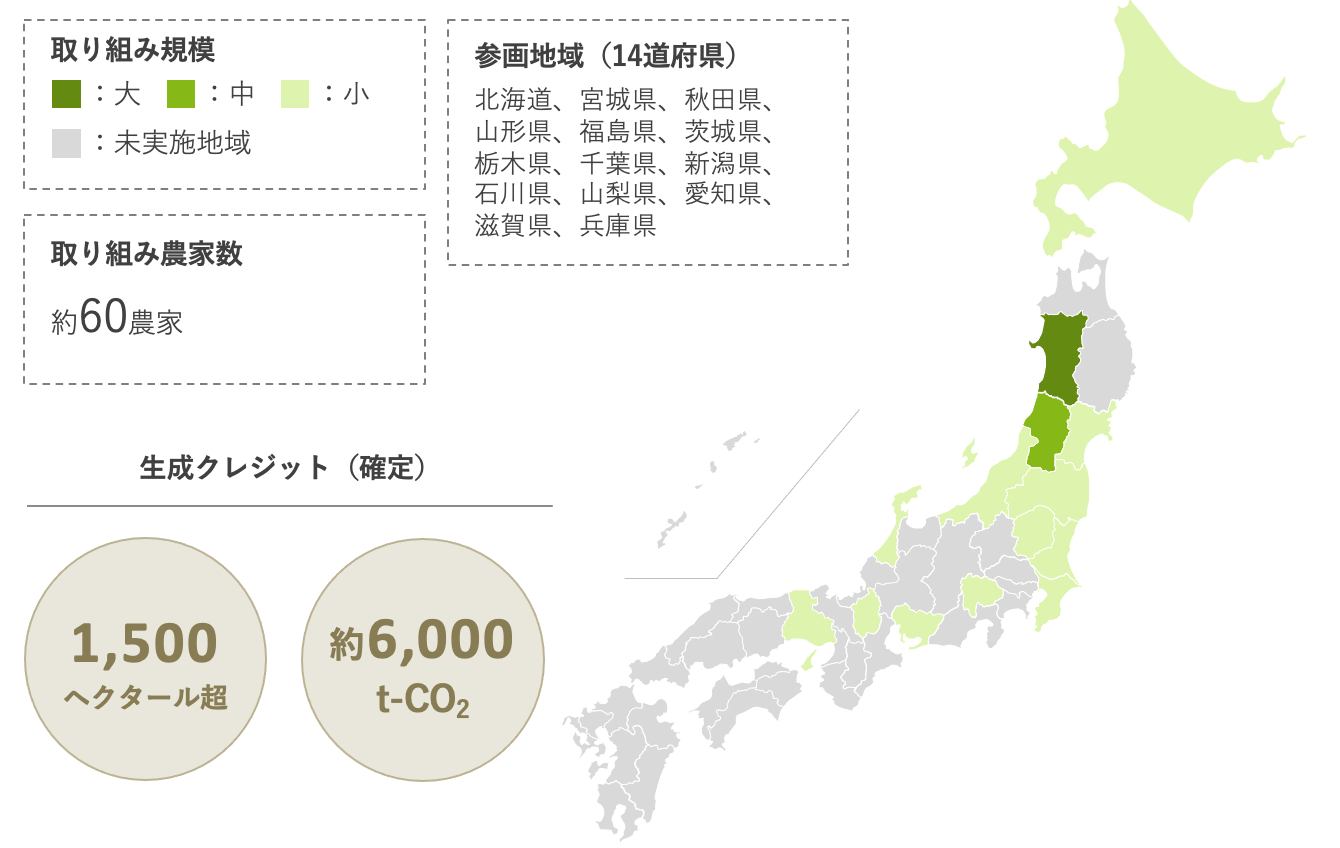 当社は、2024年1月に、1500ha※を超える生産者の皆様によって生成された約6000tのクレジットについて第58回Jークレジット制度認証委員会より認証を受けました。