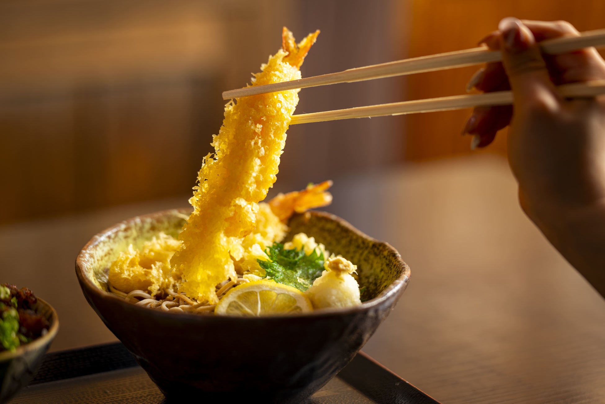 軽やかさとボリュームを兼ね備えた、おだきち自慢の季節限定御膳。衣はサクッと、中はぷりぷりの海老天は、蕎麦のおつゆにじんわりと浸ることで旨みが染みわたり、天ぷら蕎麦ならではの風味が広がります。