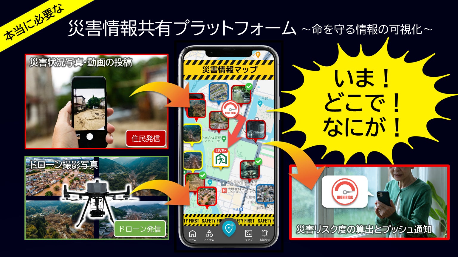 ドローン研究の第一人者である野波健蔵博士が創立した株式会社Autonomyとの協働により、最先端技術を搭載したドローン活用が実現します。最先端のドローン技術により、現場の迅速な情報収集と共有が可能となり、災害発生時の対応力を飛躍的に向上させます。ドローンによって撮影された詳細な画像や動画を基に、被害状況の可視化とともに、安全避難経路の提供が行われます。さらに、広島大学(力石研究室)との共同研究によって実現した災害リスク度の算出は、地域の安全を守るために不可欠な機能として、現在地の災害リスクをリアルタイムで把握し、プッシュ通知を通じて住民や企業に情報提供を行います。このシステムは、災害発生時における地域密着型の防災活動を支援し、住民や企業の安全を守るための強力なツールとなります。また、droptip株式会社は一般財団法人国連支援財団とグローバルパートナーシップを締結しており、コンセプト、機能が「災害情報共有プラットフォーム」になりうる可能性が高いと評価されています。