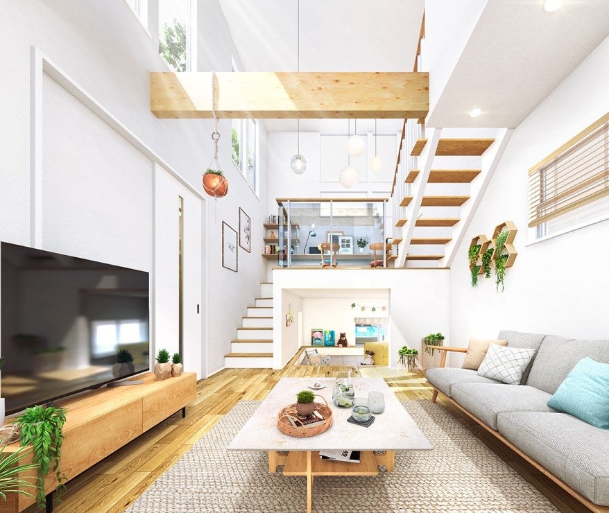 リビング+αの多彩な空間や、広がりを生み出す新発想のプランニングを実施しました。建売住宅でありながら、注文住宅レベルのアイデアを各邸に込めることで、家で過ごす時間に心地よさと愉しさを生み出します。心地よいテキスタイルフロアや中二階に設けられたスキップフロア(Laughラフ竹ノ塚エクステール)、開放感のあるリビングに家族共有スペースがあることで、ライフスタイルに合わせ大人も子供もリラックスできるプランとなっています。※全棟邸別設計となっておりますので、号棟により採用状況が異なります。