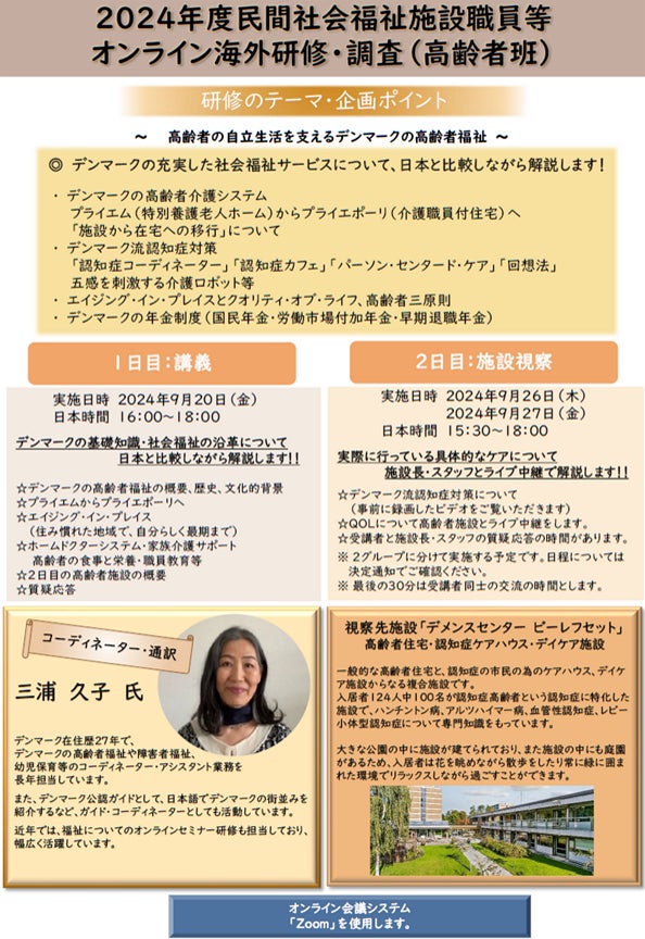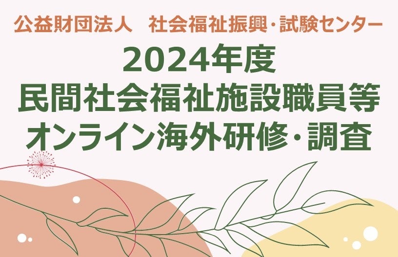 公益財団法人社会福祉振興・試験センターでは、民間社会福祉施設等で働く介護職員、生活支援員等の職員が諸外国における福祉の最新情報や知識について学ぶことを目的としてオンライン海外研修を実施します。