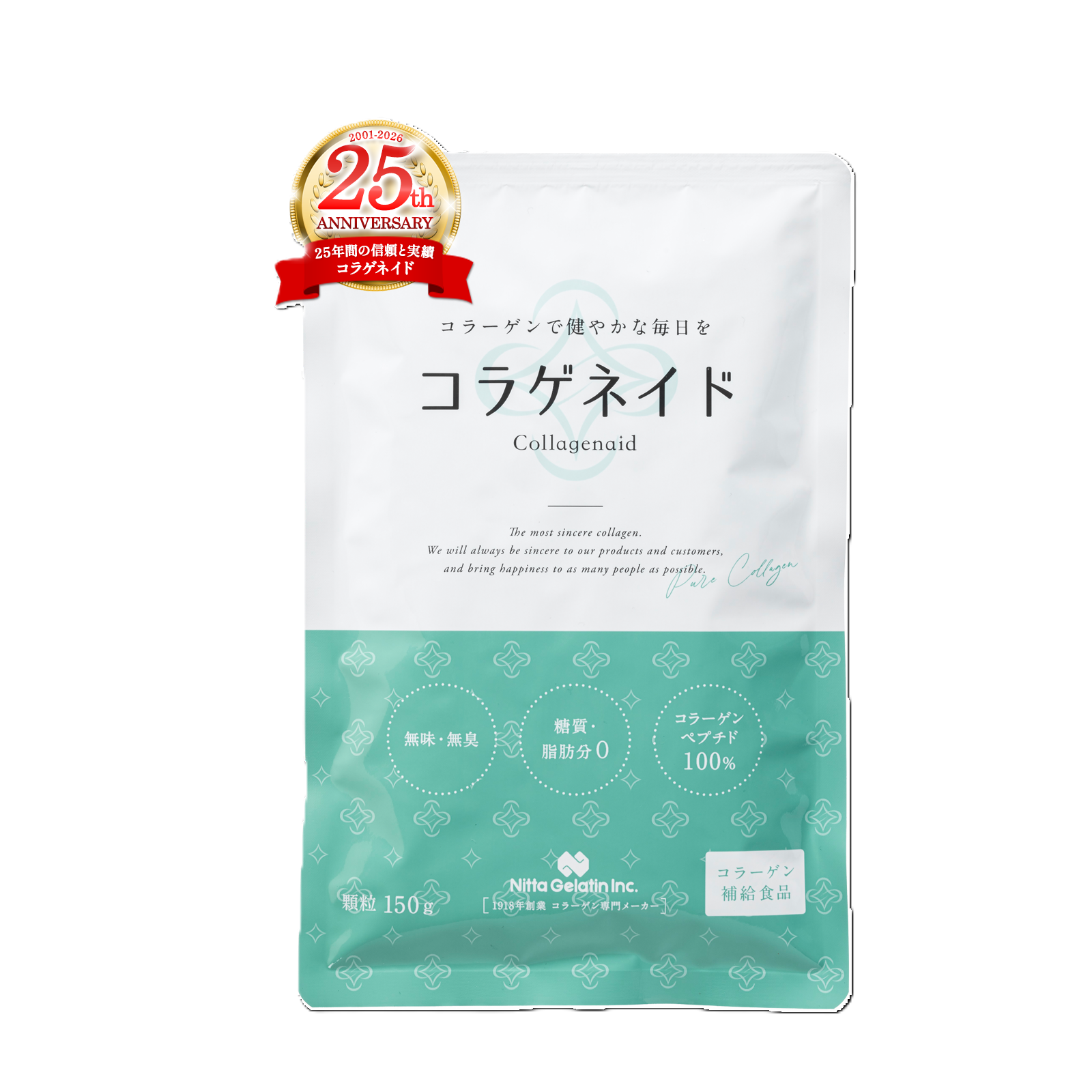 新田ゼラチン株式会社(本社:大阪府八尾市二俣2丁目22、代表取締役社長:竹宮秀典、以下新田ゼラチン)は、自社ブランドのコラーゲン補給食品「コラゲネイド」が2026年4月に発売25周年を迎えたことをお知らせいたします。これを記念し、長年ご愛用いただいているお客様への感謝を込めたプレゼントキャンペーンを始め、様々な企画を2026年4月から1年間を通して行っていきます。