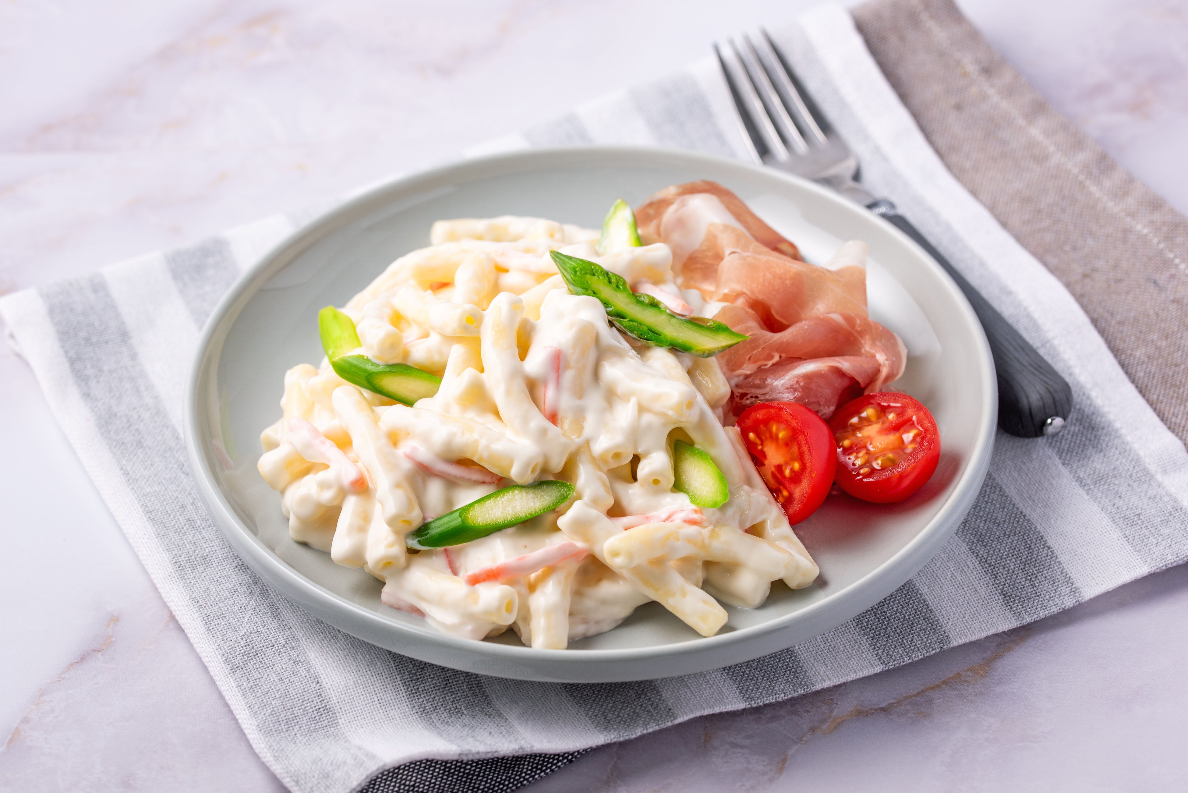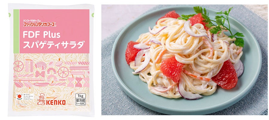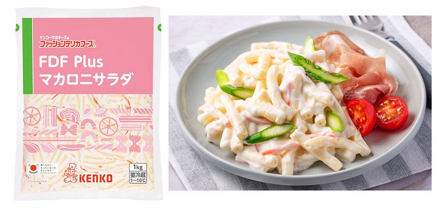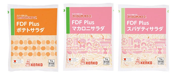 『FDF Plus ポテトサラダ』は、10ミリの角切りタイプとつぶしタイプのじゃがいもをバランス良くあわせ、角切りのにんじんとたまねぎを加えました。じゃがいもの風味をしっかりと味わえます。『FDF Plus マカロニサラダ』と『FDF Plus スパゲティサラダ』は、それぞれデュラム小麦100%のコシのある食感のマカロニやスパゲティに、薄切りのたまねぎと千切りのにんじんを加え、他の食材ともあわせやすくクセのないしっかりとした味わいに仕上げました。いずれも外食や中食業態で小鉢や総菜などに幅広く活躍します。