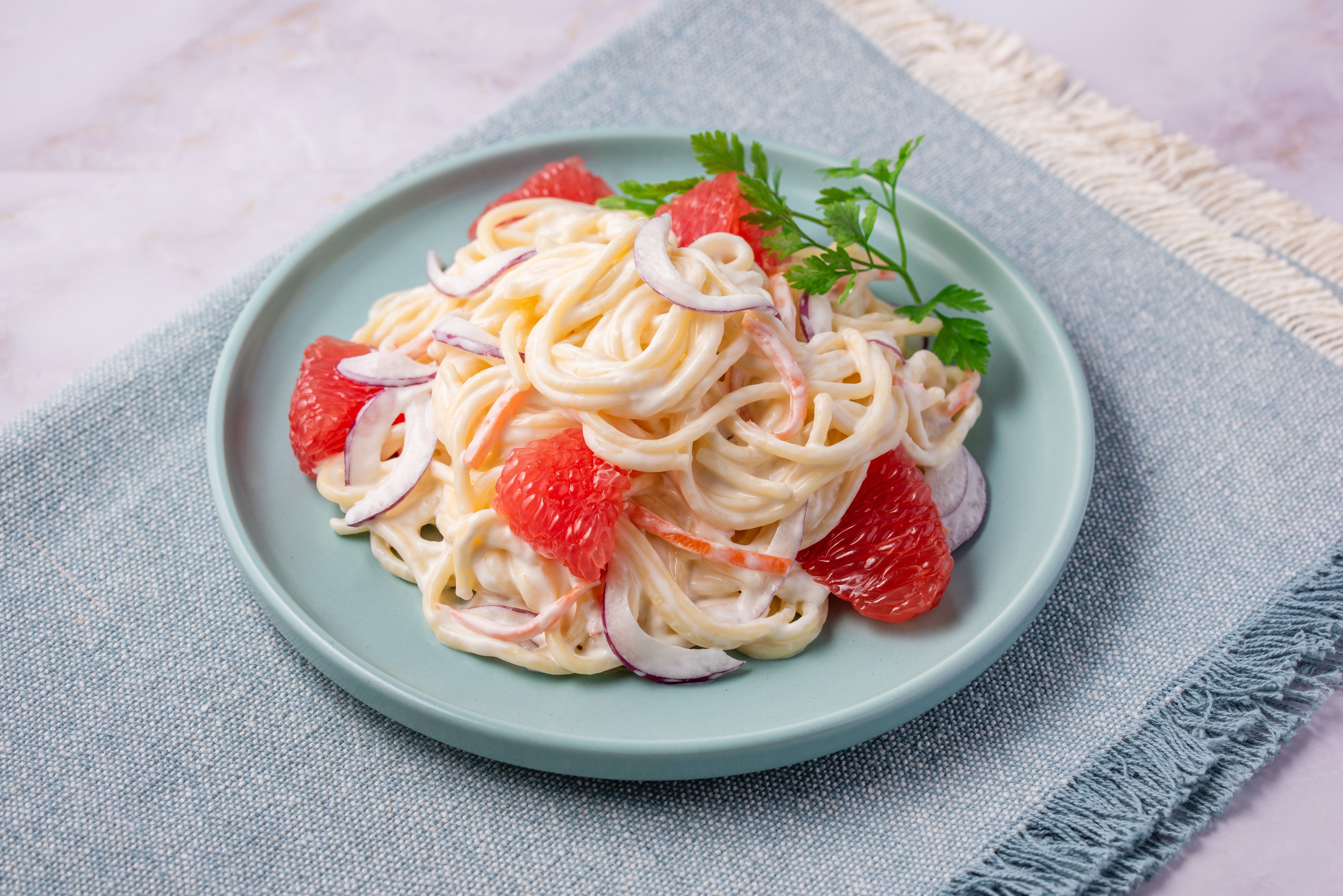 デュラム小麦100%のコシのある食感のスパゲティに、薄切りのたまねぎと千切りのにんじんを加えました。他の食材ともあわせやすいクセのないしっかりとした味わいに仕上げています。美味しさはそのままに製造日+90日の賞味期間です。