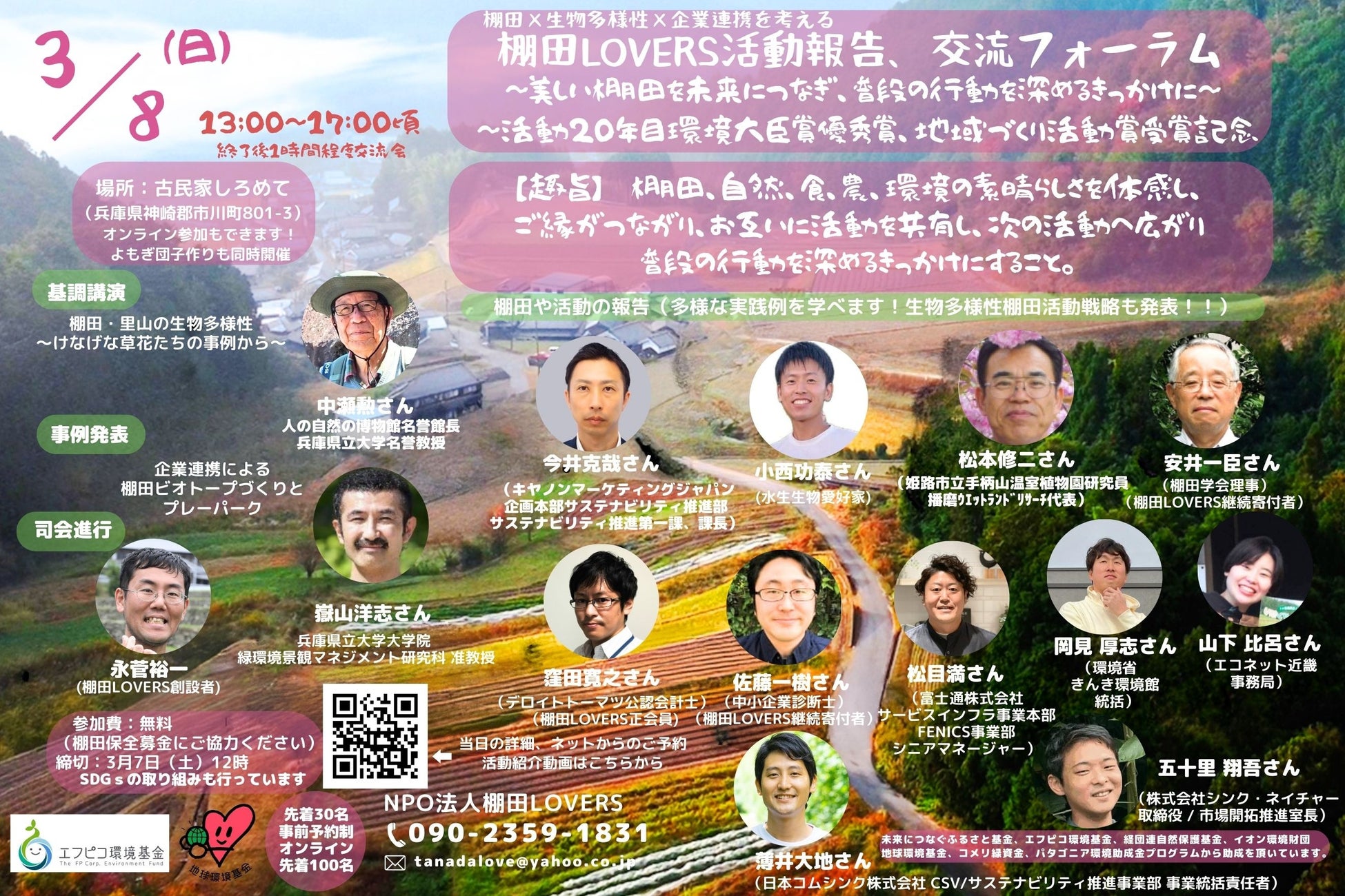 NPO法人棚田LOVERS(兵庫県市川町)は、2026年3月8日(日)13時より、「棚田LOVERS活動報告、交流フォーラム」を開催します。本フォーラムは、環境大臣賞優秀賞および地域づくり活動賞の受賞を記念し、棚田・里山の生物多様性、企業や専門家との連携、地域での実践事例を共有し、参加者一人ひとりの「普段の行動」を深めるきっかけづくりを目的としています。