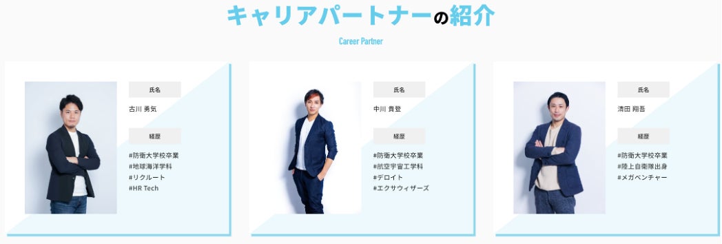 キャリア形成に関する知識と自衛隊経験を持ったキャリアパートナーが、業界人材ならではの悩みに丁寧に寄り添い、ユーザーのキャリアプラン形成を共に設計します。