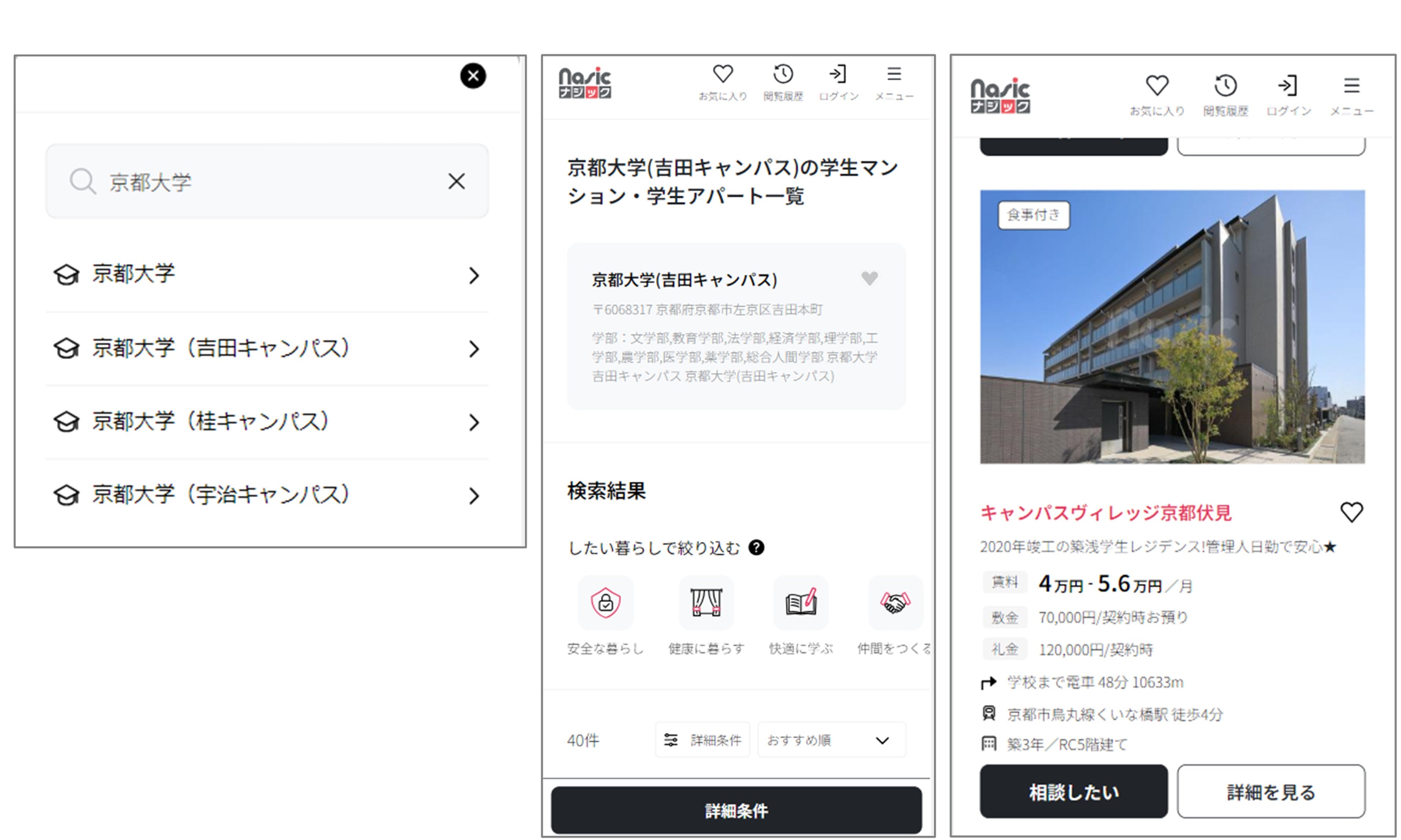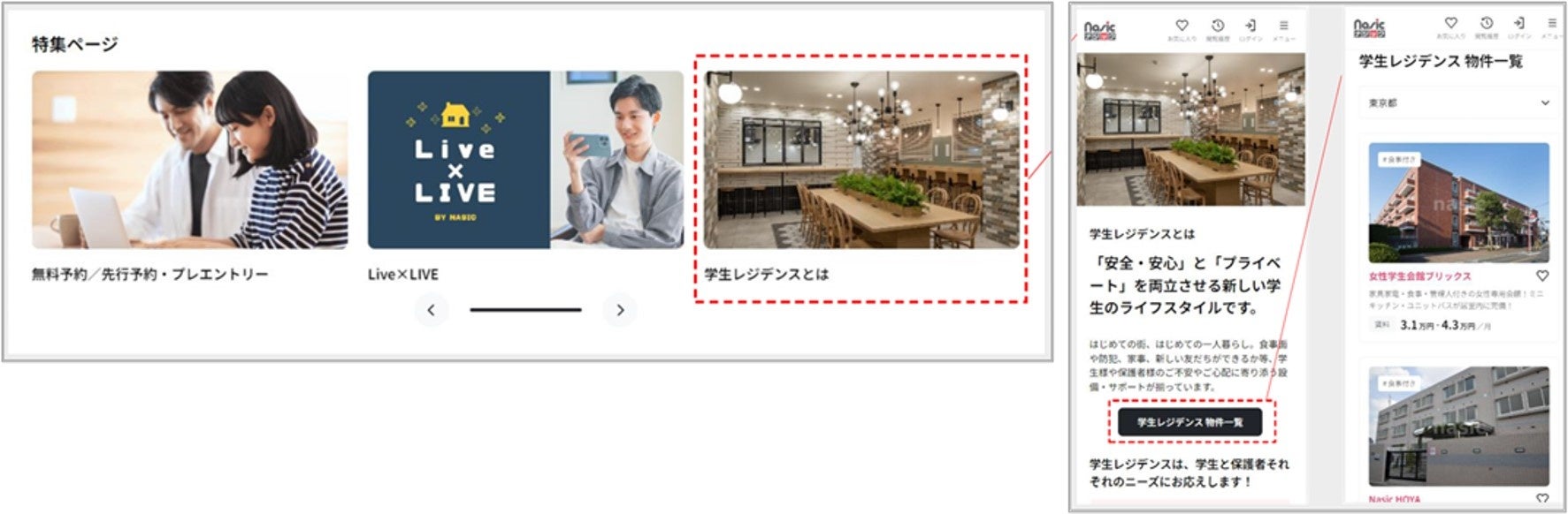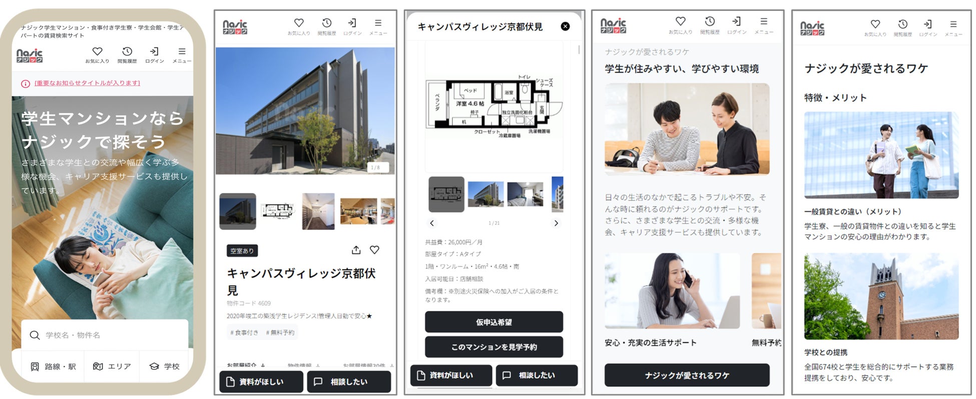 また、入居後のキャンパスライフをイメージいただくために、当社の入居学生だけに従前からご提供しているキャリア形成を支援するプログラムやコミュニティ形成を促進するイベント、各種優待サービスなどの事例も多彩に掲載しています。単なる物件や部屋の情報にとどまらず、当社ブランドを一貫したコンセプトに基づいて、「ナジックの物件に住むとこんな学生生活が送れる」ことをお伝えするサイトに生まれかわりました。