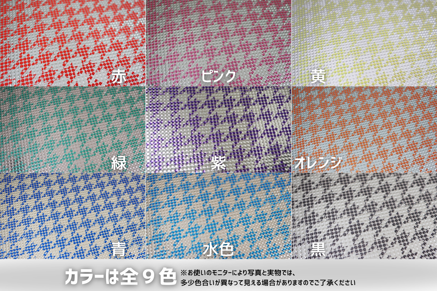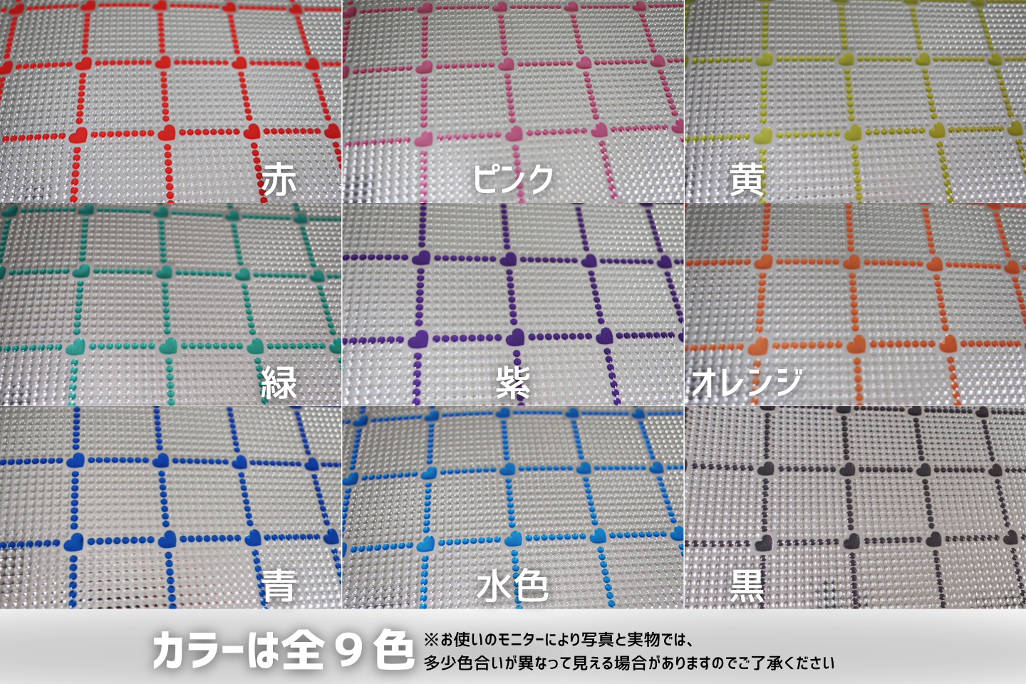 カラー展開:赤、ピンク、黄、緑、紫、オレンジ、青、水色、黒