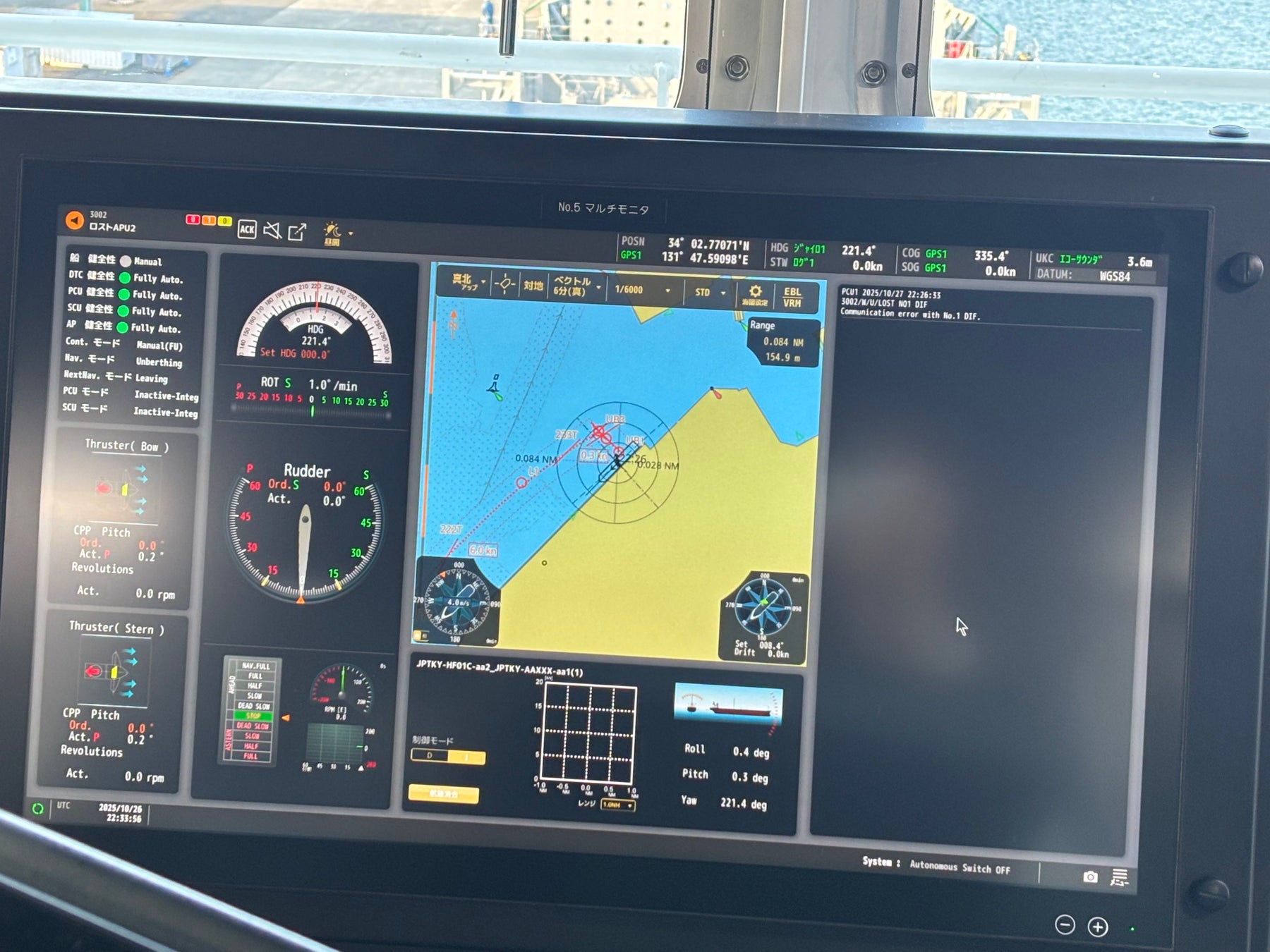 実証船「げんぶ」の自動操船コントローラー(Drive Train Controller: DTC)に、東京計器が開発した操船制御機能を実装しました。本機能により、従来のトラックコントロールシステムによる大洋航海中の舵制御に加え、離着桟時のスラスター制御を含めた低船速での操船制御が可能になりました。また、DTCの情報表示器であるDIF(DTC Interface)を搭載し、離着桟制御に必要な情報を集約して表示します。これにより、「離桟」「大洋航海」「着桟」の一連の航海において、シームレスな船体制御を実現し、安全な自律航行に貢献しています。