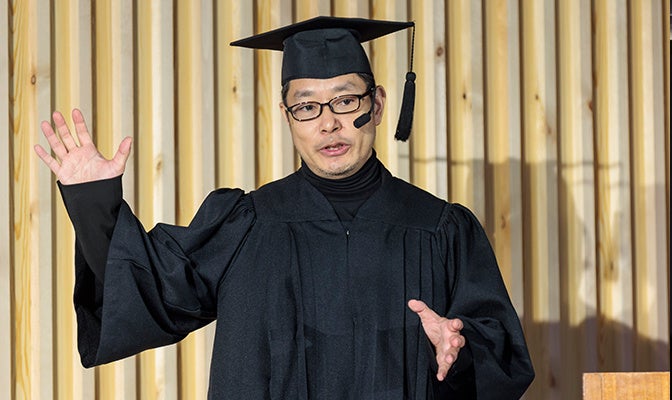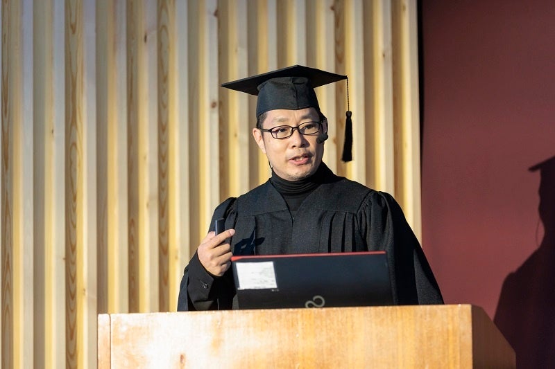 最終選考会は、60回目の開催となる三谷情報フェアの一環として行われて、今回の三谷情報フェアは、三谷情報大学附属高校というコンセプトで行われていて、三谷社長が理事長として付け髭までつけて登場して、私たち登壇者は、卒業研究の発表という流れでした。