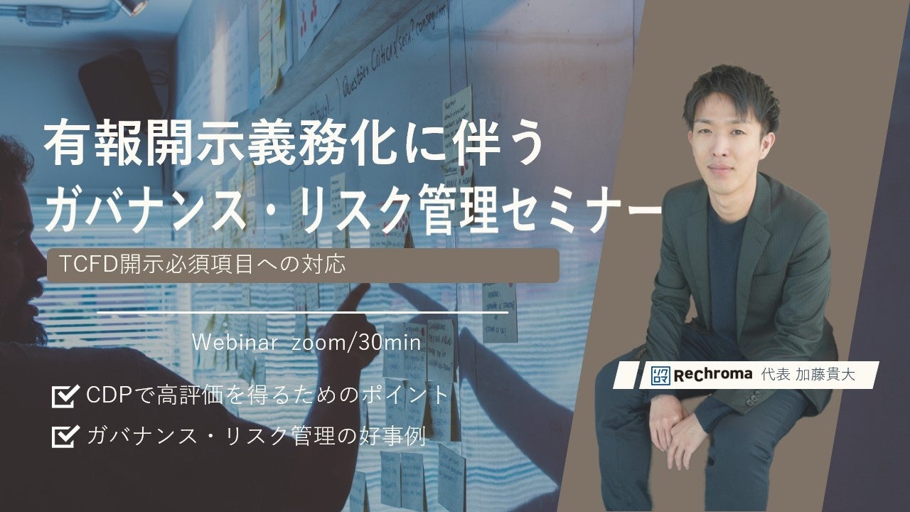本セミナーにはCDP出身の弊社代表が登壇し、有報で求められる「ガバナンス」「リスク管理」の開示内容について解説します。また、CDPで高評価を得るためのポイントについても、事例とともに解説します。