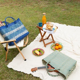 バッグ自体が自立する特徴があり、地面に直置きできるのでキャンプやピクニックのシーンでも大活躍。また、無造作に置いただけでも絵になる個性的な配色や編み柄は、キャンプサイトでも楽しい気分にしてくれる。