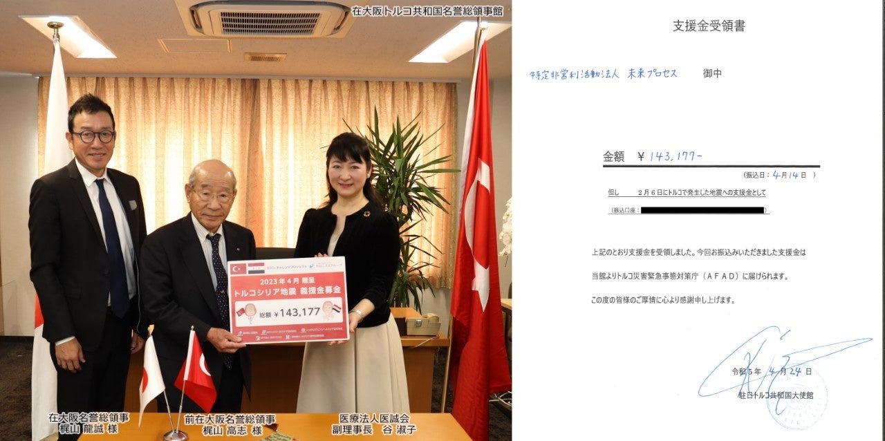この義援金は駐日トルコ共和国大使館を通じて、本国のトルコ災害緊急事態対策庁(AFAD)に送られ、被災者の生活支援に充てられます。