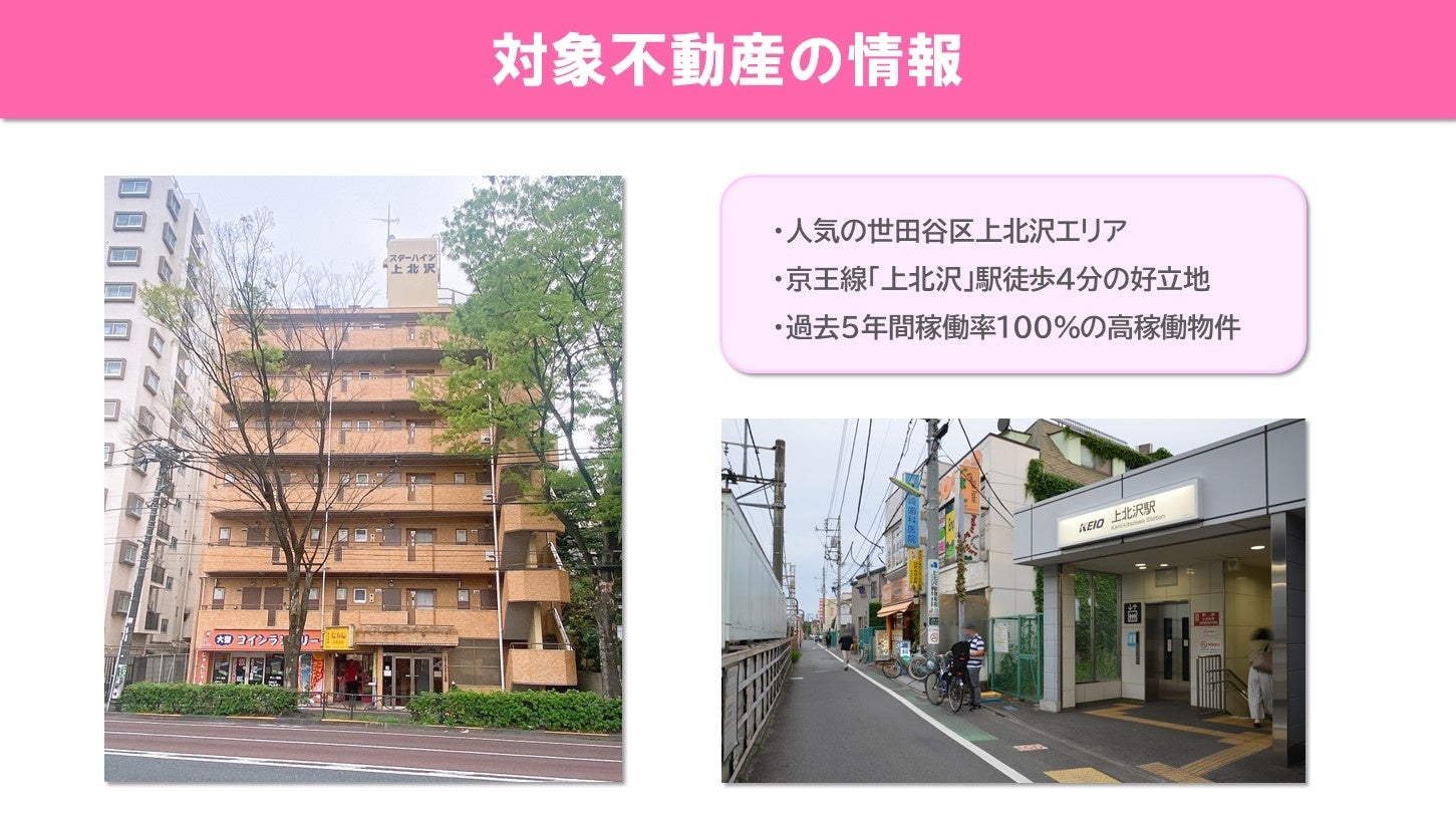 対象不動産は、東京都世田谷区上北沢に所在するマンションの1F店舗部分です。本物件は、現在、株式会社フロンティアグループが所有し、過去5年間、安定した賃貸運営をしております。本プロジェクトはその安定した賃料収入を原資として、投資家の皆さまへ分配を行う、インカムゲイン型プロジェクトです。