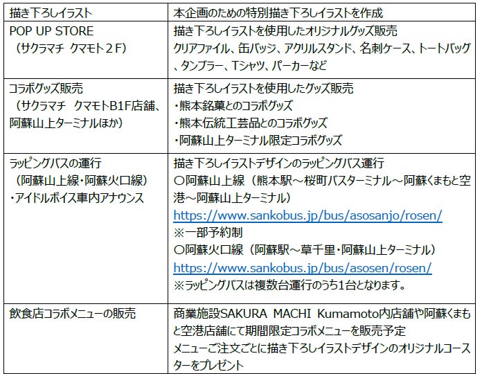 コラボレーション期間中、熊本市内の商業施設「サクラマチ クマモト」2Fでは限定POP UP STOREの開設、アイドル「小日向美穂」による車内アナウンスを行う熊本―阿蘇間のラッピングバス運行、コラボレーショングッズ・メニューの販売等を予定しています。その他にも、様々な企画を予定しておりますので、続報をお待ちください。