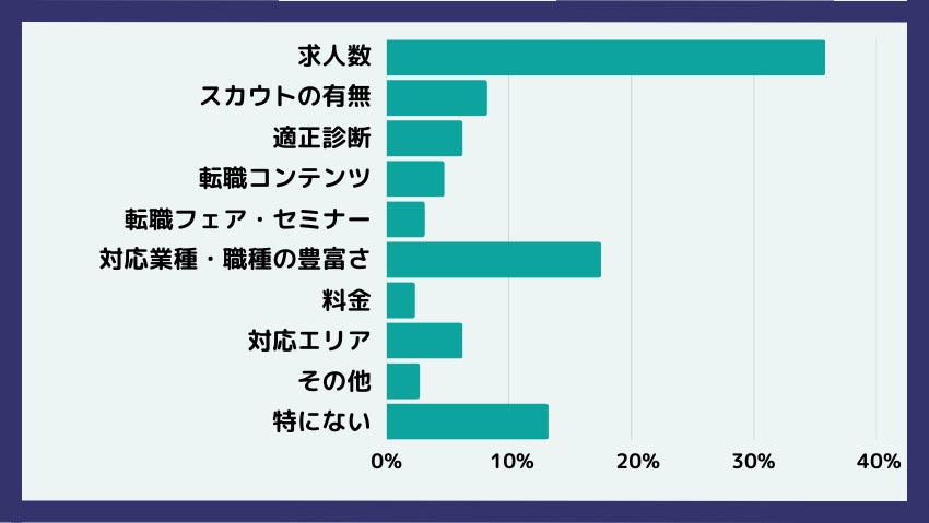 転職サイトを選ぶ際には「求人数」と「対応業種・職種の豊富さ」の2点が、特に重視するポイントとして挙がりました。