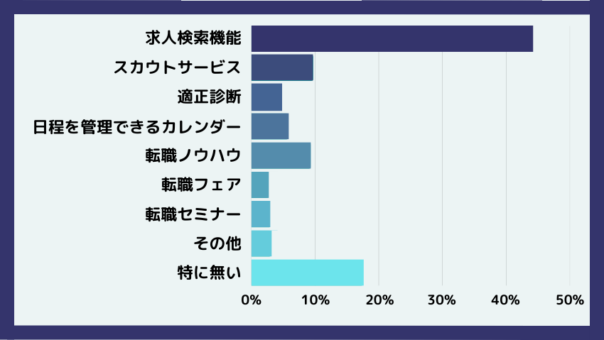 転職サイトを利用して、最も便利だった機能・サービスについては「求人検索機能」が44%と圧倒的に多く、効率よく求人を探せることが転職サイトを選ぶポイントになっている。