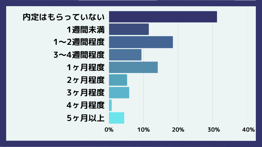 内定をもらうまでの期間は「内定はもらっていない」が31.1%、「1~2週間程度」が18.3%という結果になりました。