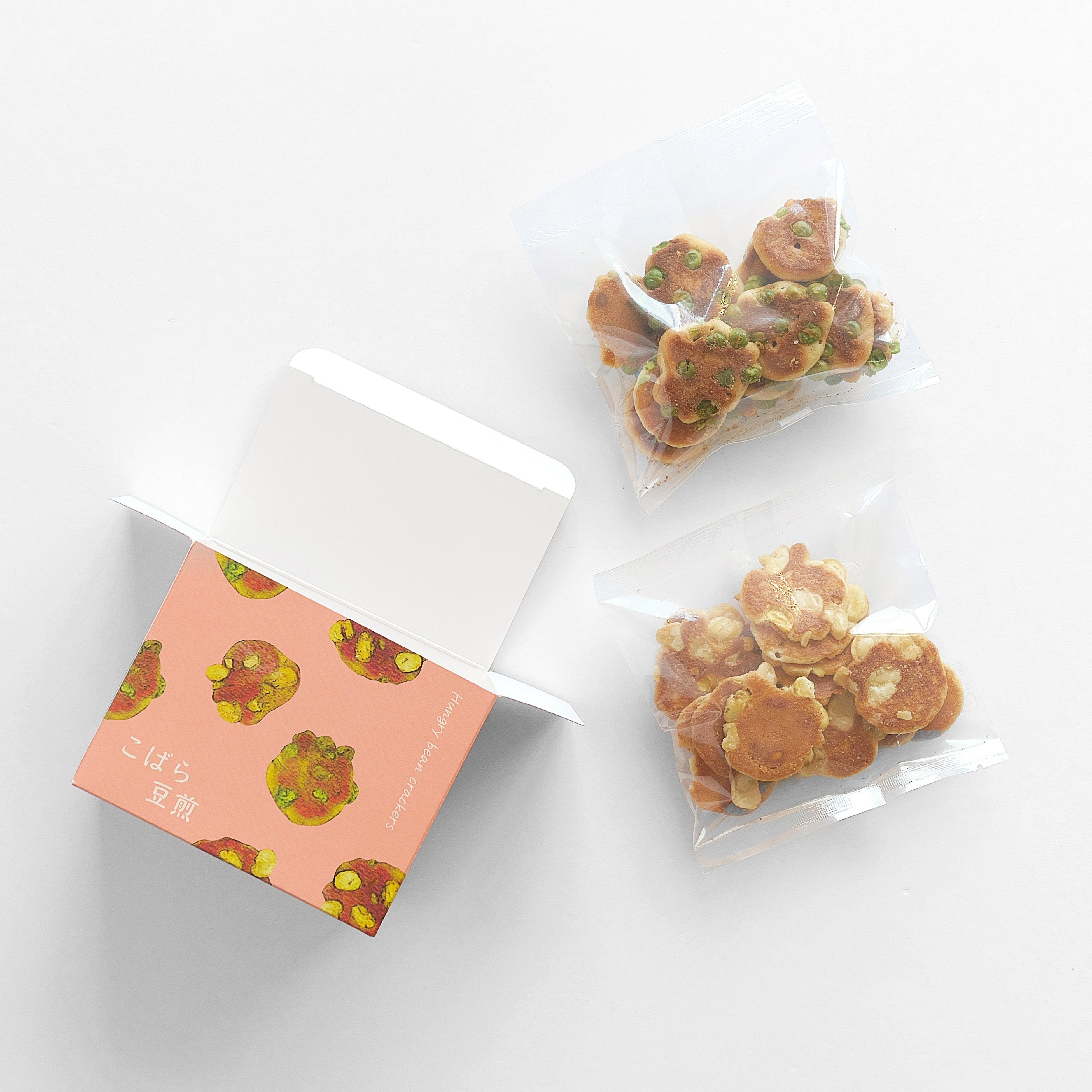 生地を薄く仕上げてサクサク感を引き立てたそら豆煎と、厚めの生地を軽く焼き上げ、えんどう豆の旨味を活かしたえんどう豆煎。