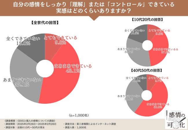 また、『自分の感情をしっかり「理解」または「コントロール」できている実感はどのくらいありますか?』と、感情のコントロールについても聞いてみました。