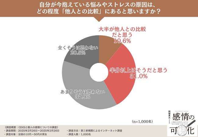 続いて、『自分が今抱えている悩みやストレスの原因は、どの程度「他人との比較」にあると思いますか?』と聞いたところ、「大半が他人との比較だと思う(10.6%)」「半分以上はそうだと思う(31.0%)」と全体の4割ほどが、他人との比較にあると感じていることがわかりました。