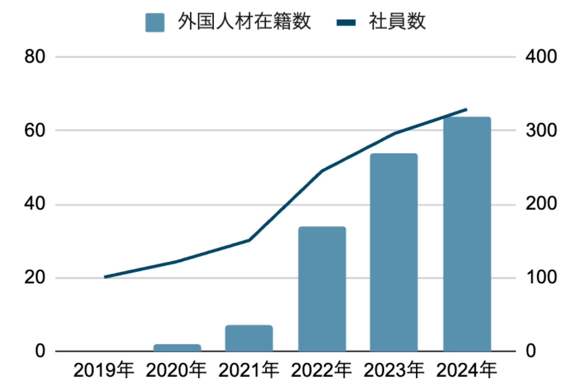 2020年に初めて外国人材2名が入社し、2021年に7名、2022年には34名と徐々に在籍数が増え、2024年6月現在64名まで増員されています。