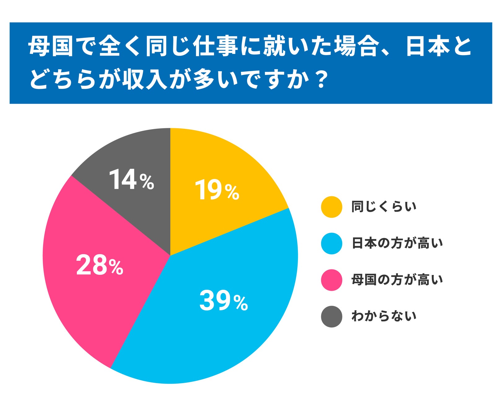 「母国で全く同じ仕事に就いた場合、日本とどちらが収入が多いか」をきいたところ、「日本の方が高い」と答えたのは39%に留まり、「同じくらい」「母国の方が高い」と答えた42%を下回りました。