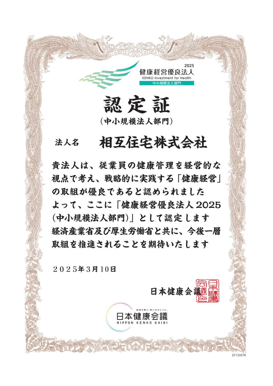 相互住宅株式会社(本社:東京都品川区、代表:武富正夫)は、2025年3月10日付で「健康経営優良法人2025(中小規模法人部門)」に認定されました。今後も、社員が心身ともに健康でいきいきと仕事に取り組めることが、社員一人ひとりのWell-Beingに繋がり、社員と当社が共に成長するための基盤にもなるとの認識のもと、健康経営に取り組んでいきます。