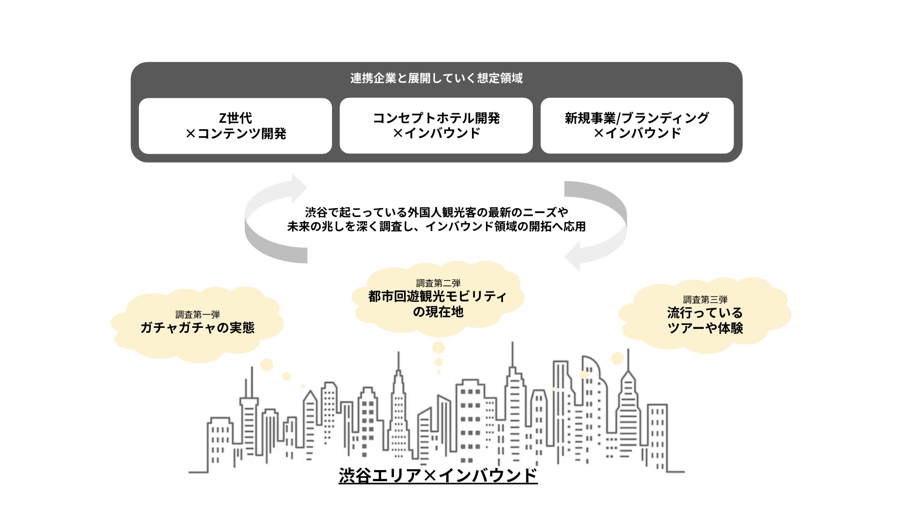 私たちはインバウンド事業への開拓を考える企業様への支援の一環として、こうした最新のインバウンドに関する調査データのレポーティングを実施しながらアーカイブし、連携企業様と共同で観光地・渋谷におけるインバウンド×Z世代向けのコンテンツや、渋谷の文化を読み解いたインバウンド向けのコンセプトホテルや文化体験ツアー、インバウンド領域向けの新規事業開発やブランディングなどへ展開していくことを想定しています。