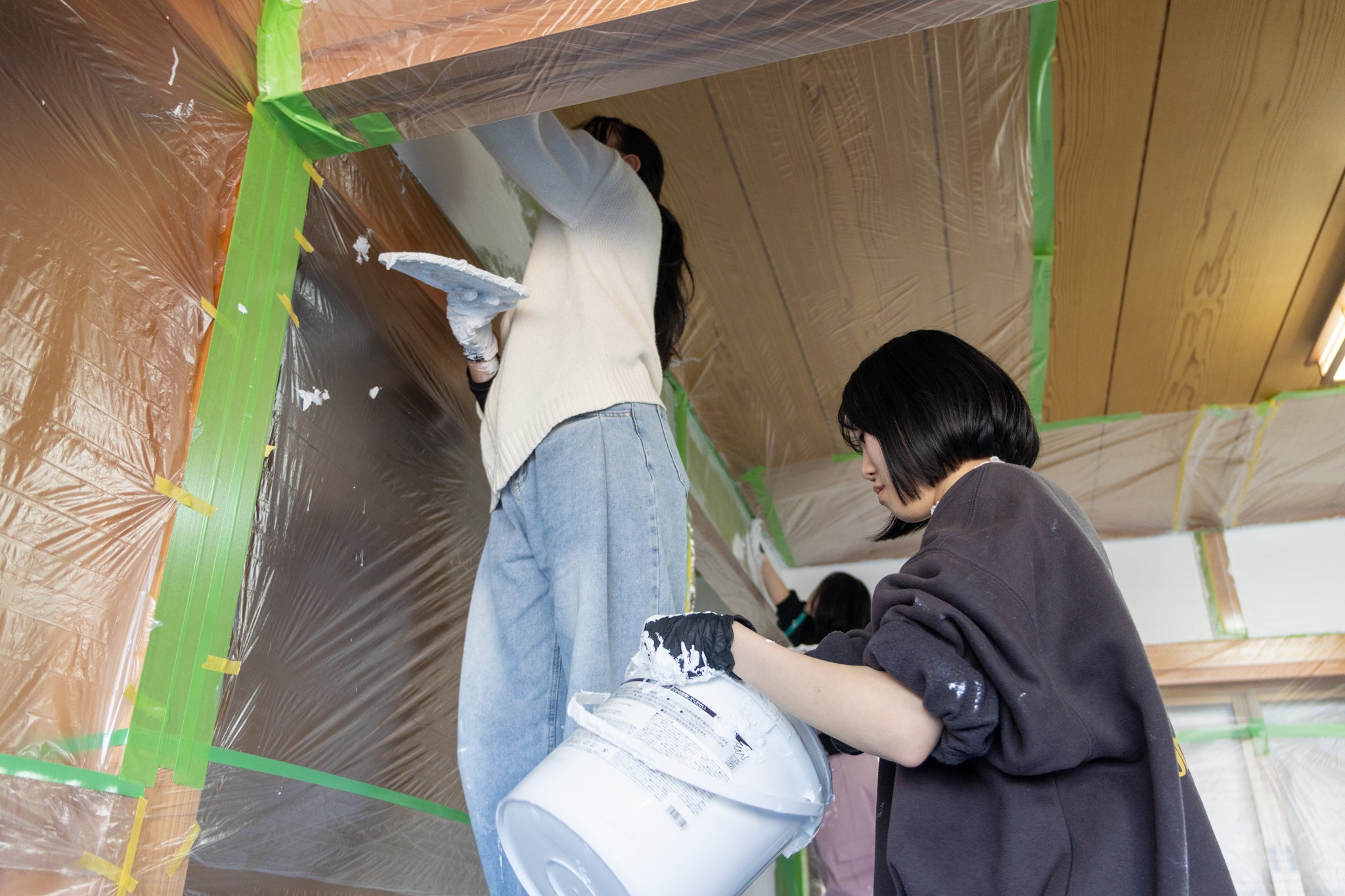 2025年12月〜2026年3月にかけて、私たちは大学生たちと複数回にわたり菅島に渡航し、拠点作りを進めました。空き家の片付けから始まり、養生や下地塗り、壁塗り、照明・椅子・机の搬入、組み立てなど…。学生たちと共に手を動かしながら、拠点としての形を少しずつ整えていきました。