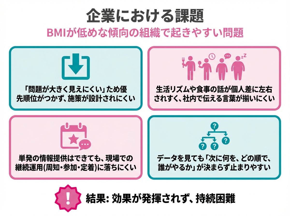 BMIが低めな傾向が見られる組織では、次のような主な課題が起きやすくなります。
