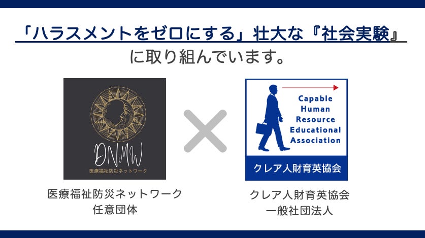 当財団(※)では、「ハラスメントをゼロにする」という壮大な社会実験を行なっています。企業の雇用と労働、採用の課題を【教育】と【仕組み】で解決するための2つのアプローチを発明しました。採用、組織の課題は全てクレアが解決します。また、経営者のノーベル賞と称される財界研究所から出版した「ハラスメントが」会社を潰す。(チームクレア著)」では、大手書店の週間ランキングイベント1位(4冠)を記録しています。